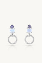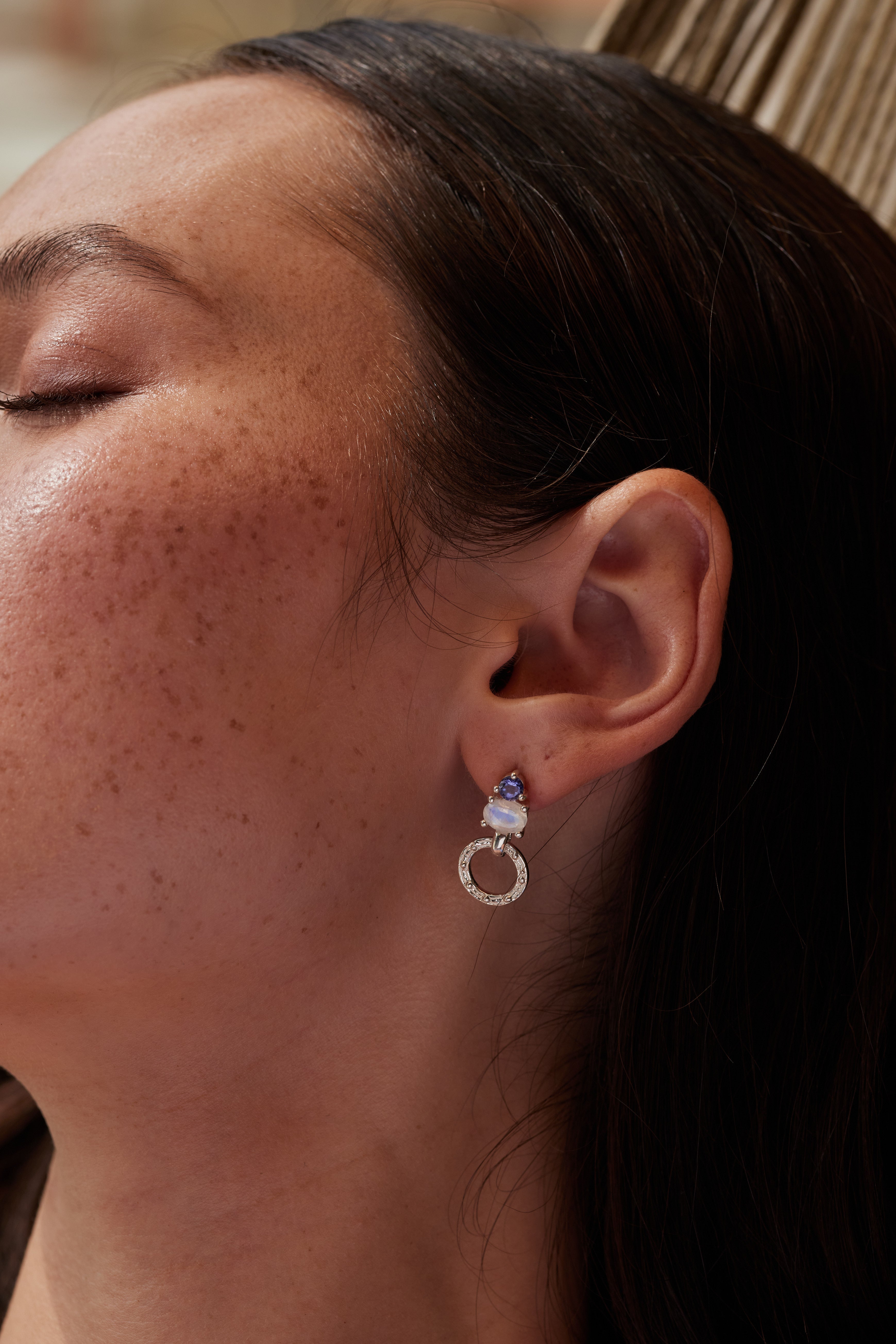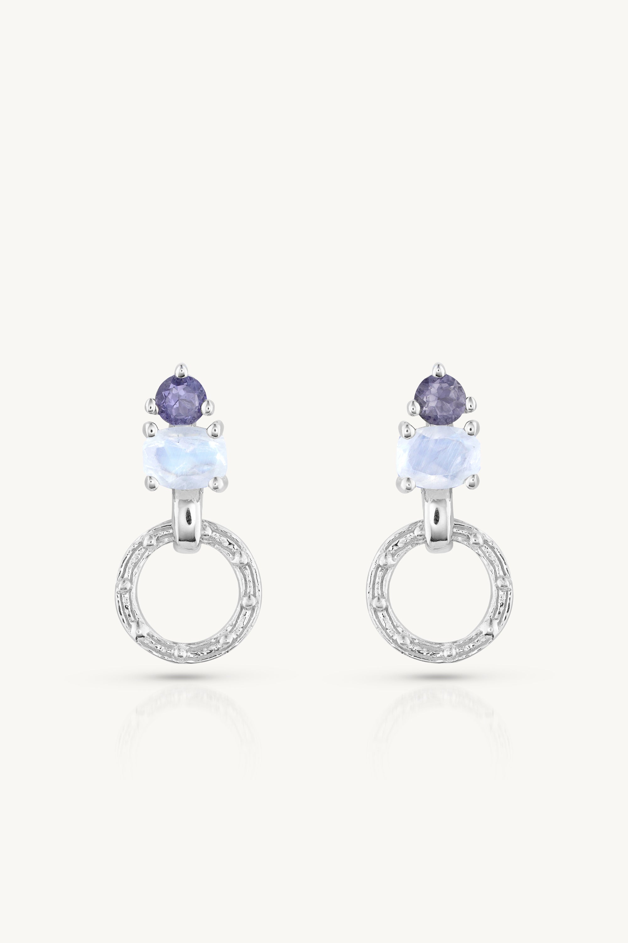 The Raaya Earrings are a balance of rich hues and artisanal textures, designed to stand out. A deep Iolite and glowing Moonstone sit above a beautifully textured ring, where fine line and dotwork add a handcrafted touch.