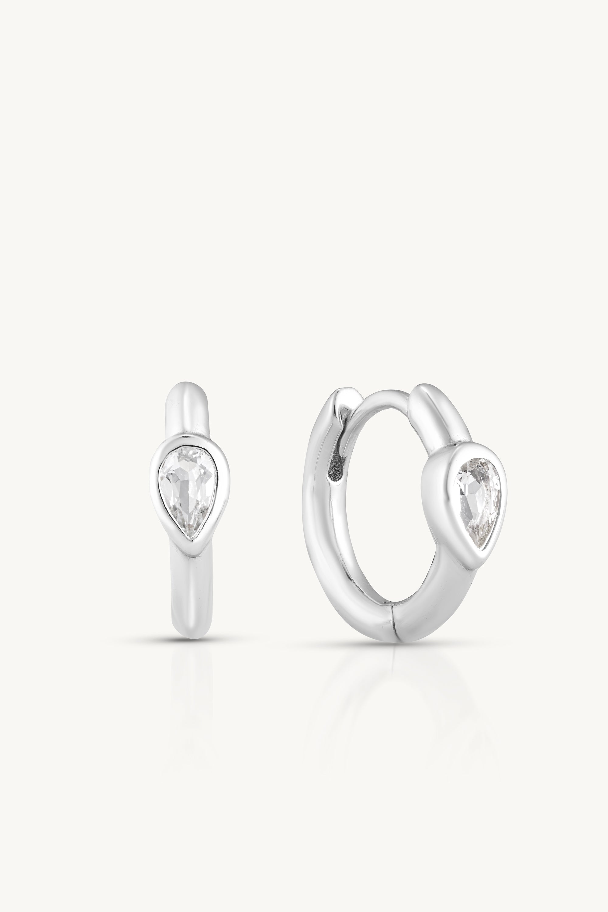 Set with a teardrop White Topaz in a sleek bezel, these huggies catch the light with every movement, adding shimmer and sparkle.