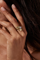 The Lune Moonstone stacker features a hand cut half moon moonstone bezel set with delicate ball detailing on either side of the stone and a double band detail.