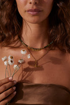 Our beautiful Flora necklace is both delicate and a statement. Made with natural tourmaline stones, this necklace is meticulously hand strung with natural earthy, forest green and aqua hues. The necklace features a spray of small petals that fan across the front of the neckline.
