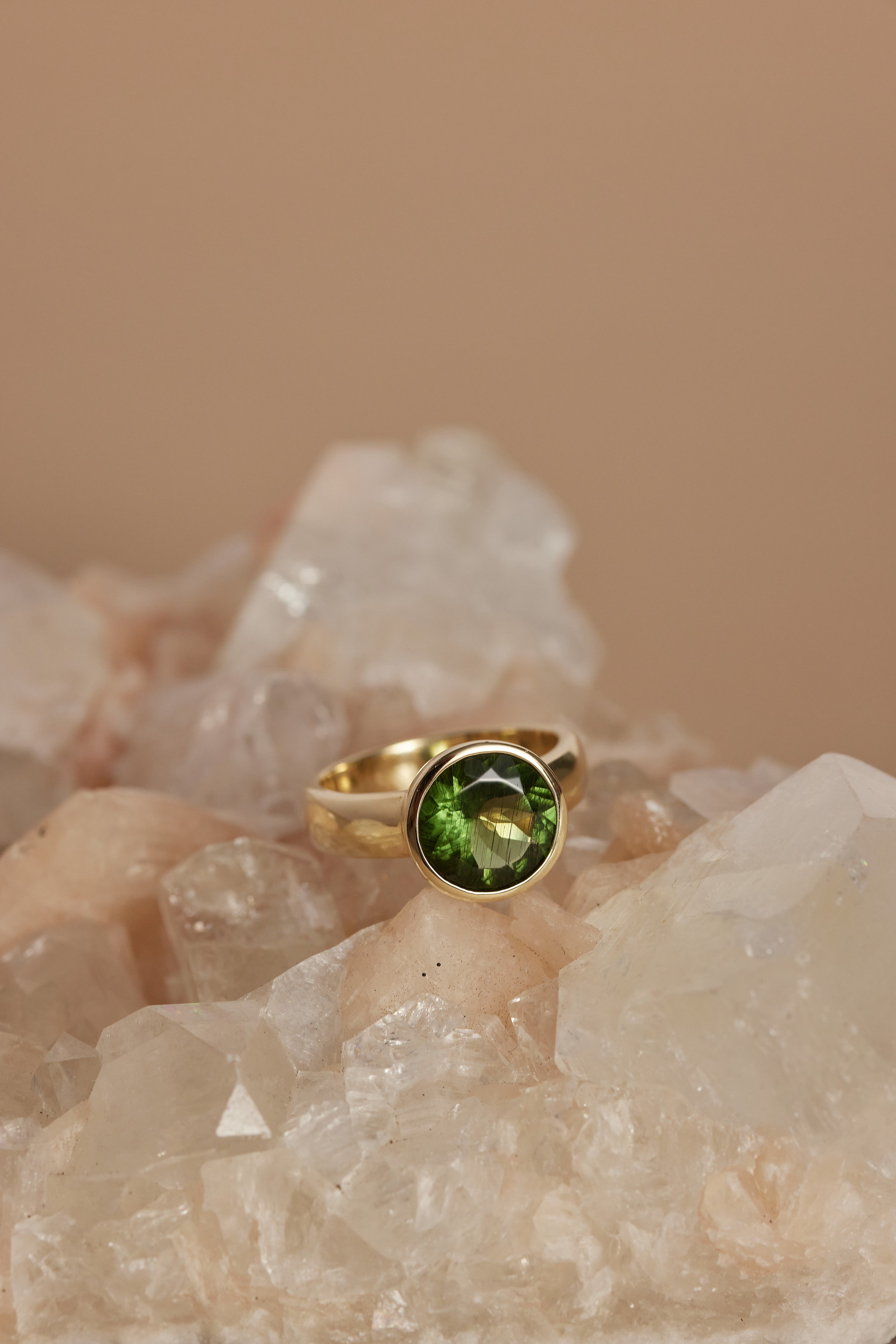 The Apatite set into this ring has a luminous forest green colouring and ads a pop of colour.