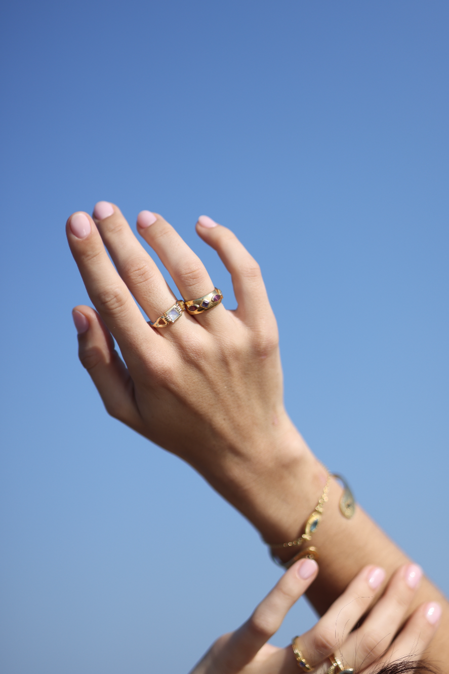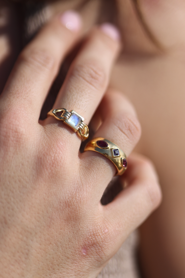 This ring features baguette cut Iolite and Marquise Cut Rhodolite bezel set into a domed band with a slightly raised stone setting.