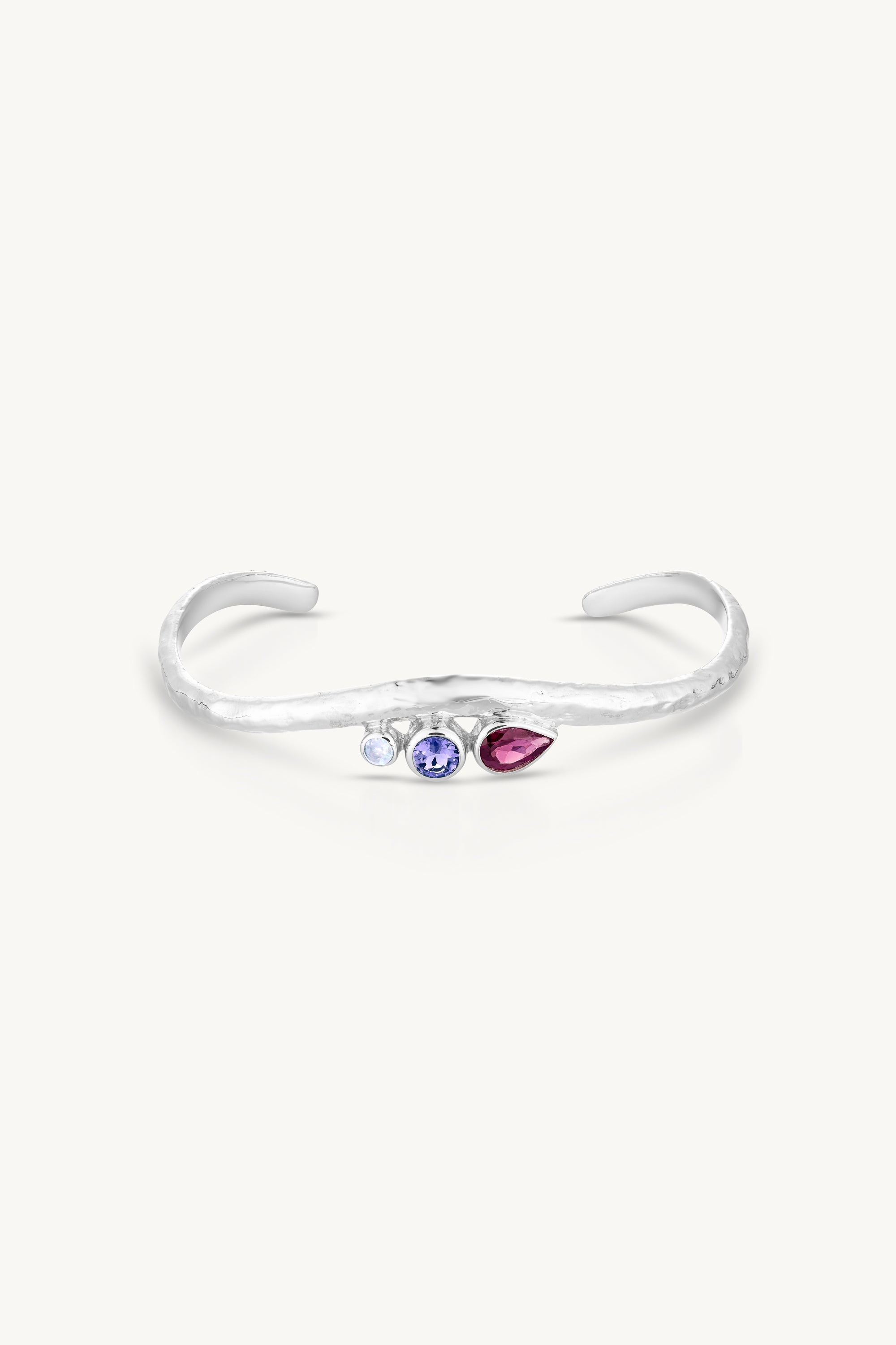 The Sorrento Cuff is an organic wave shaped cuff that features a cluster of 3 stunning luminous semi-precious jewels - Rhodolite, Iolite and Moonstone. The cuff has a natural lightly hammered finish.