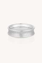 A modern mens wedding band with brushed detailing on the outside and high polish shine on the inside. Available in 9K and 14K White Gold.
