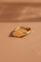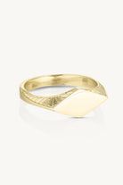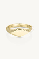 This ring features finely hand-etched patterns along its sides, reminiscent of intricate line work. At its centre sits a sleek, flat, diamond-shaped signet, blending classic and modern styles.