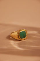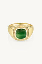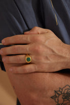The rounded Onyx, set in a sleek bezel, is enhanced by fine line work that extends from the stone. This signet exudes old-school charm and bold presence, perfect for those who appreciate a touch of vintage style.