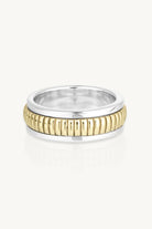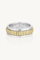 The classic Sterling Silver band is complimented by a distinctive spinning feature in brass, adorned with raised vertical lines.