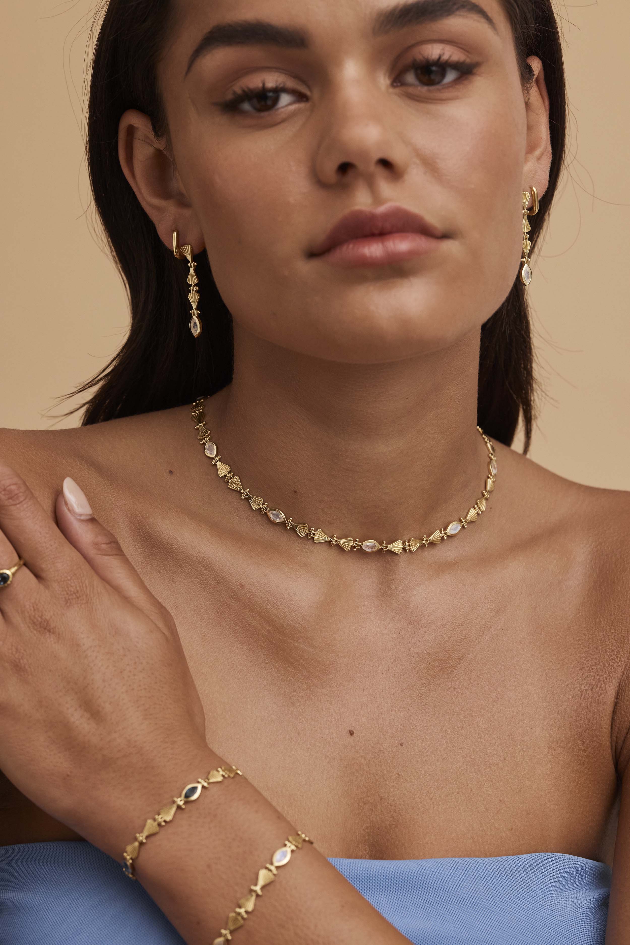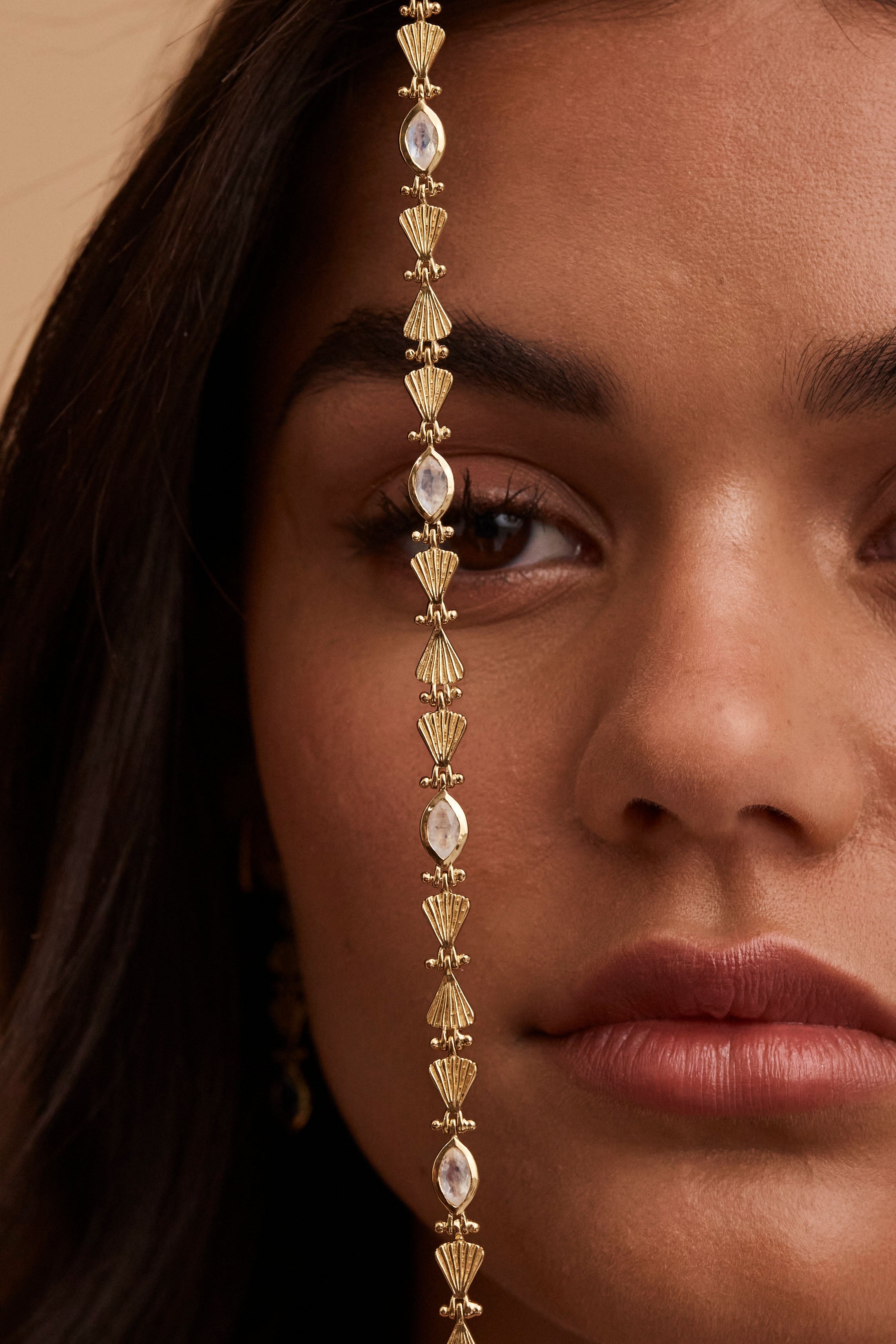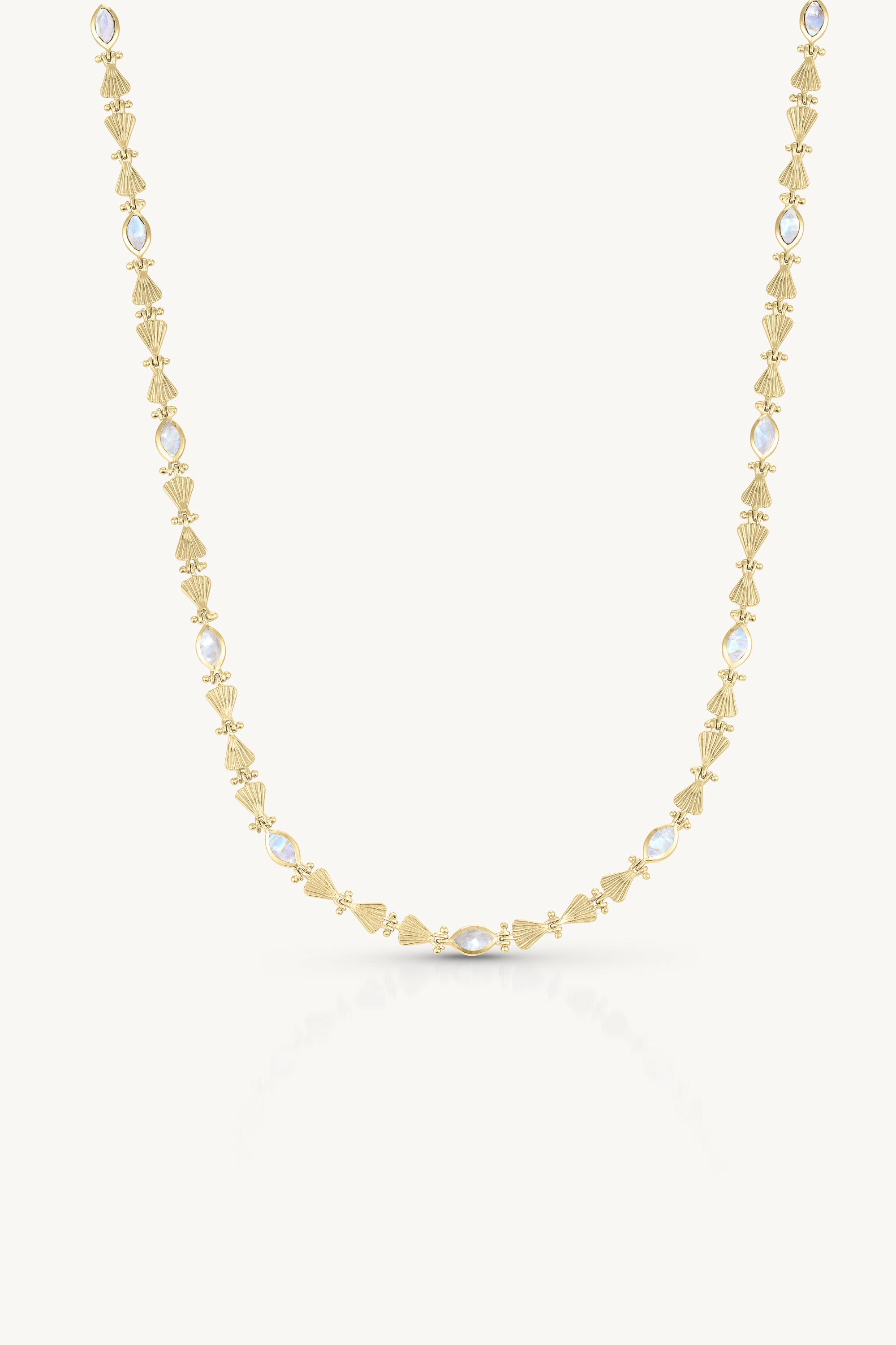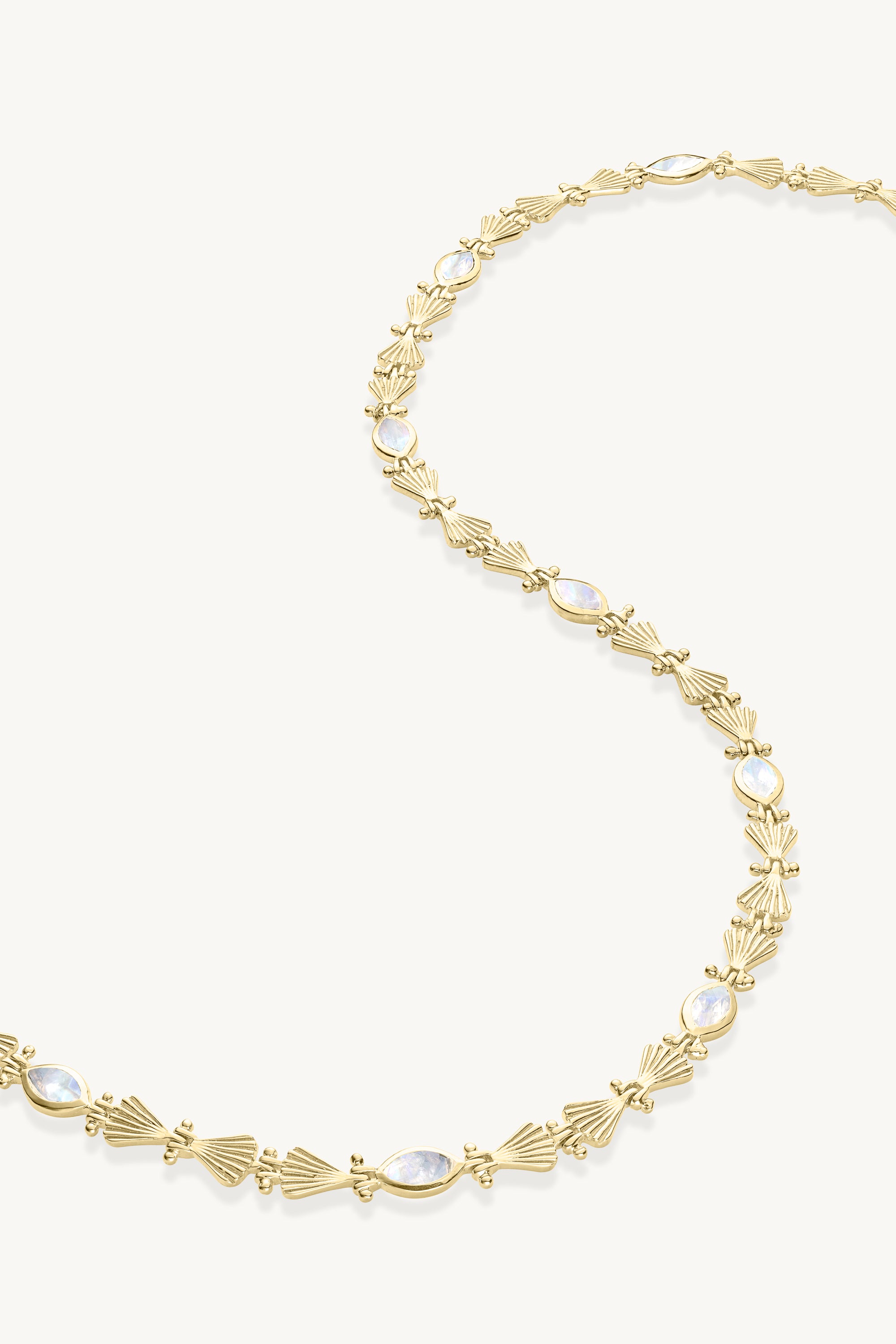 Fan-shaped links are expertly hinged, rippling with linework between marquise bezel-set Moonstones that flow across the neckline. With a form that echoes ancient relics, this piece carries quiet strength and luminous grace -  made to be admired, and worn like a talisman.