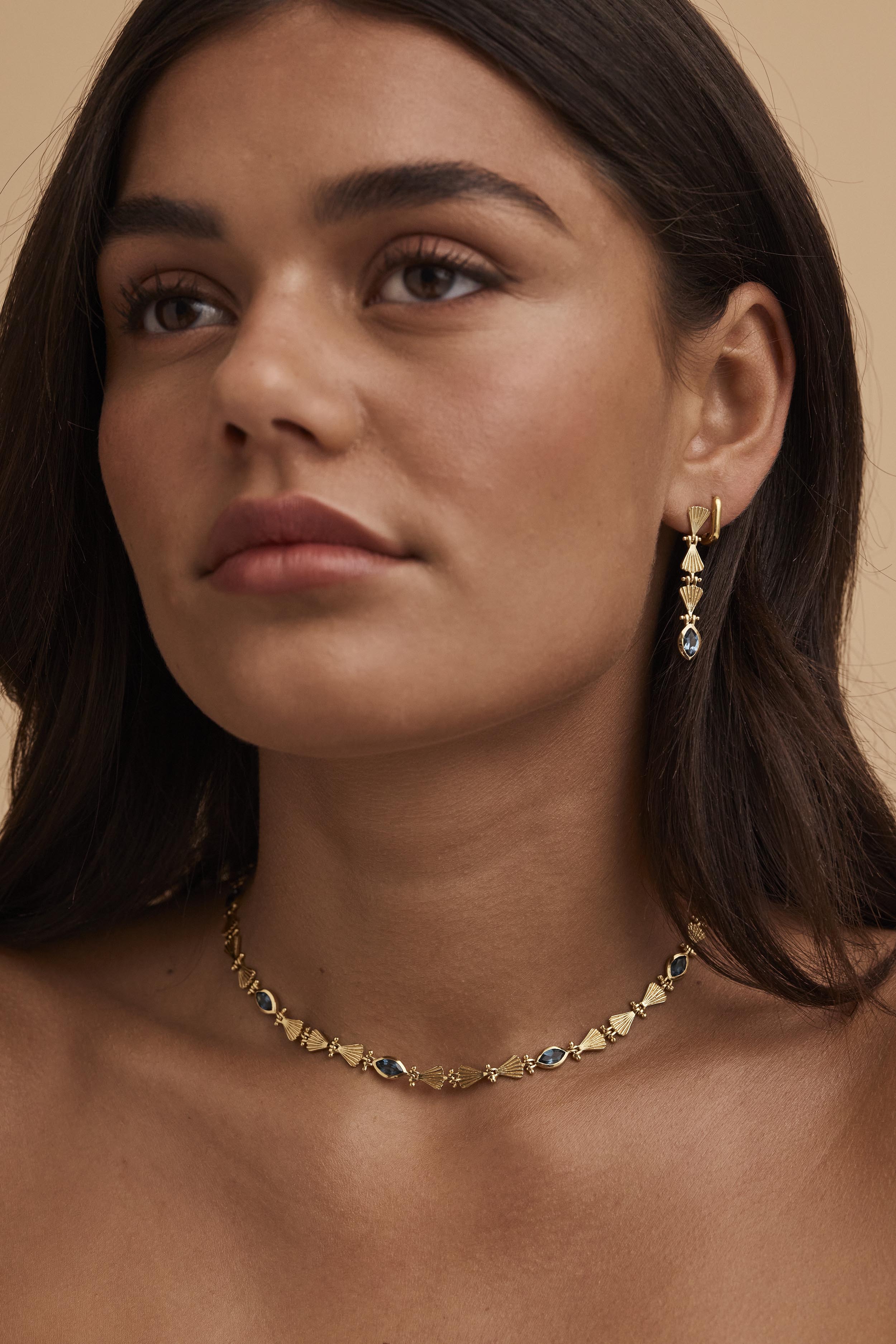 Fan-shaped links are expertly hinged, rippling with linework between marquise bezel-set Topaz stones that flow across the neckline. With a form that echoes ancient relics, this piece carries quiet strength and luminous grace - made to be admired, and worn like a talisman.