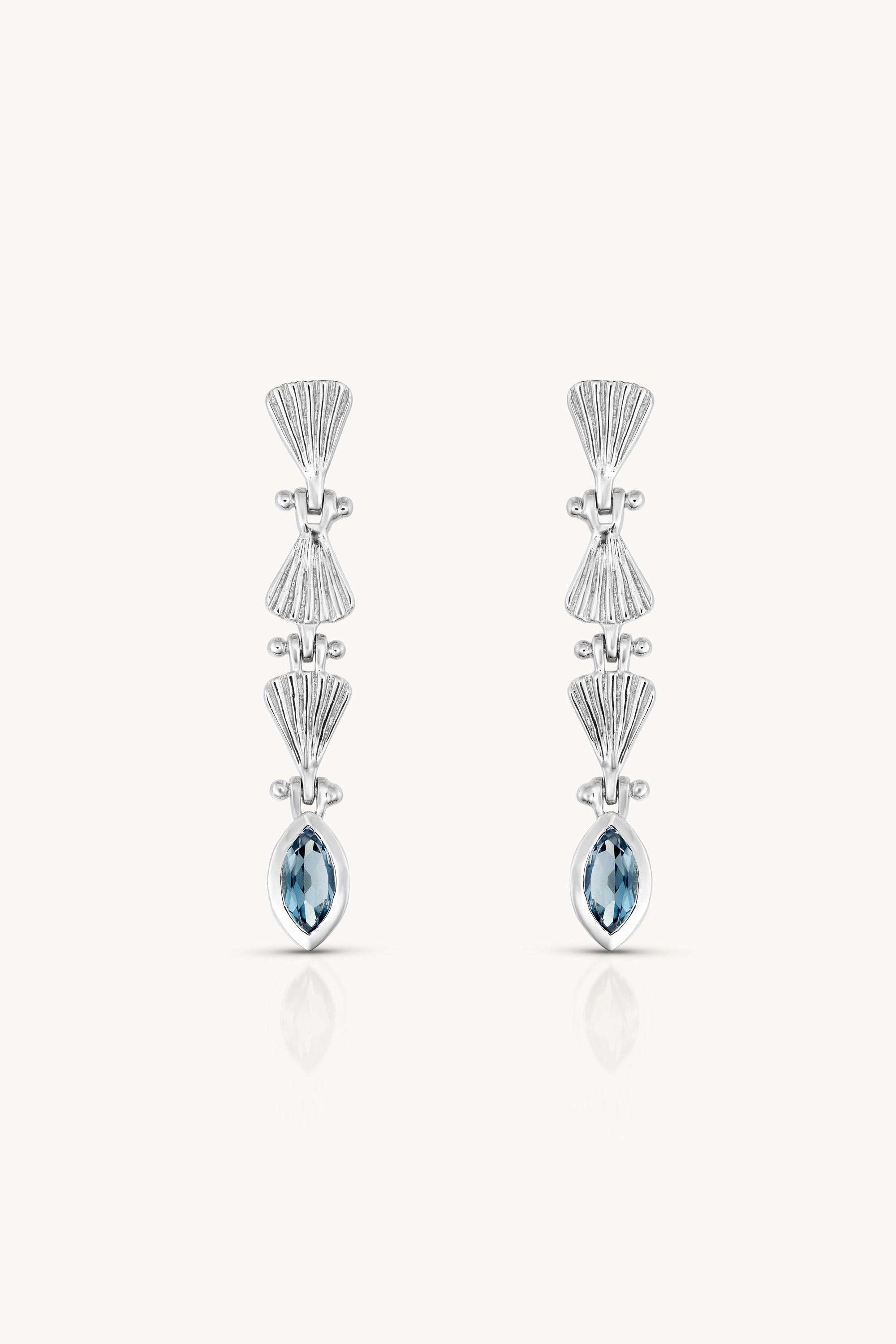 The Octavia Earrings feature a trail of finely etched, hinged fan motifs that cascade down to a bezel set shimmering marquise Topaz.