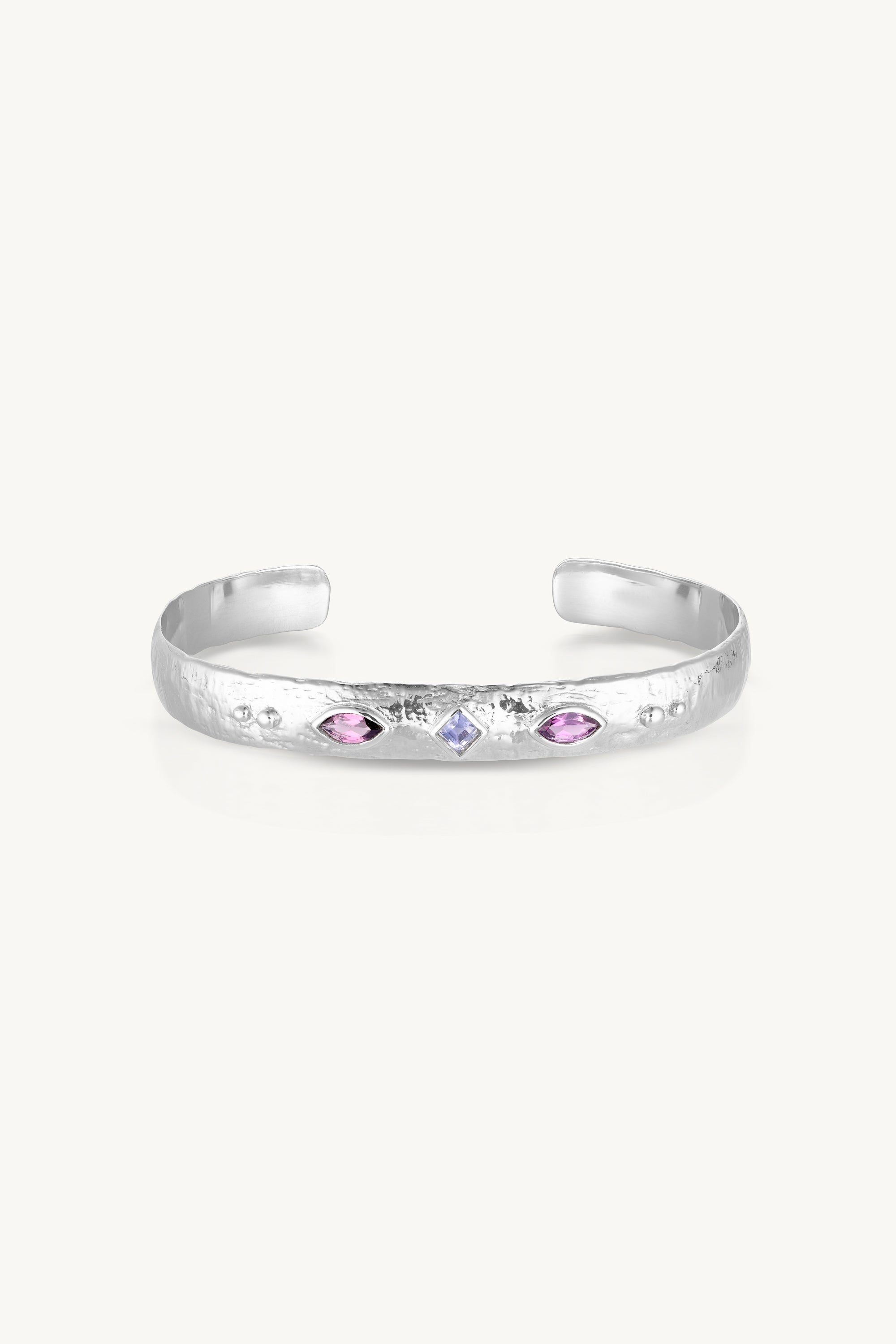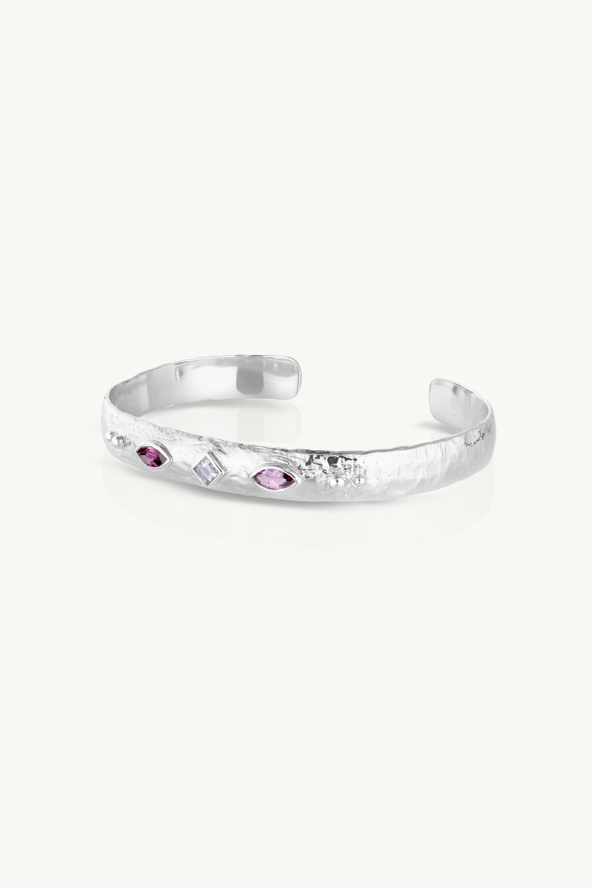 Featuring a textured band and a regal mix of baguette-cut Iolite and marquise Rhodolite in raised bezel settings, this piece is bold, intricate, and made to be worn like royalty.