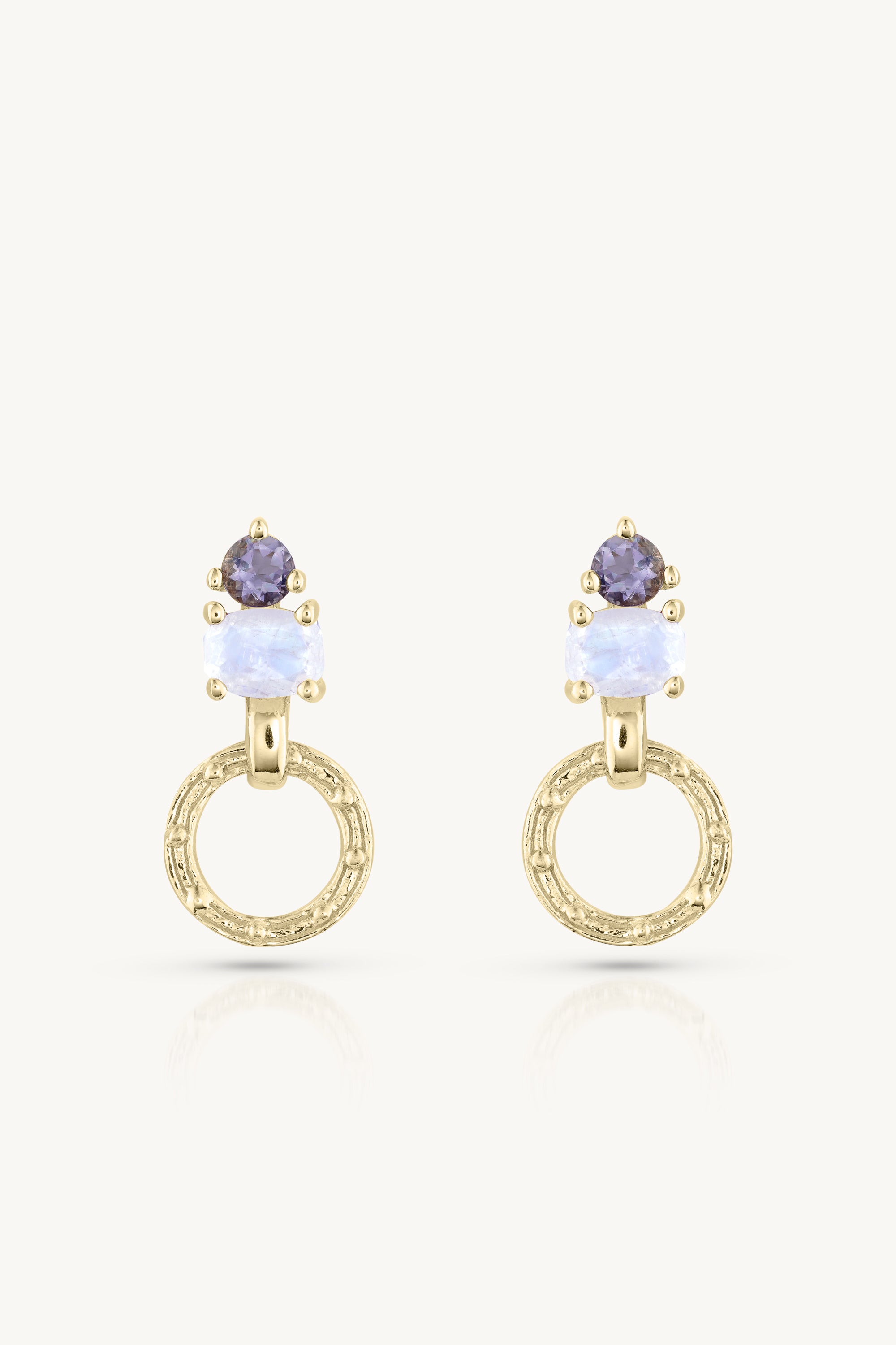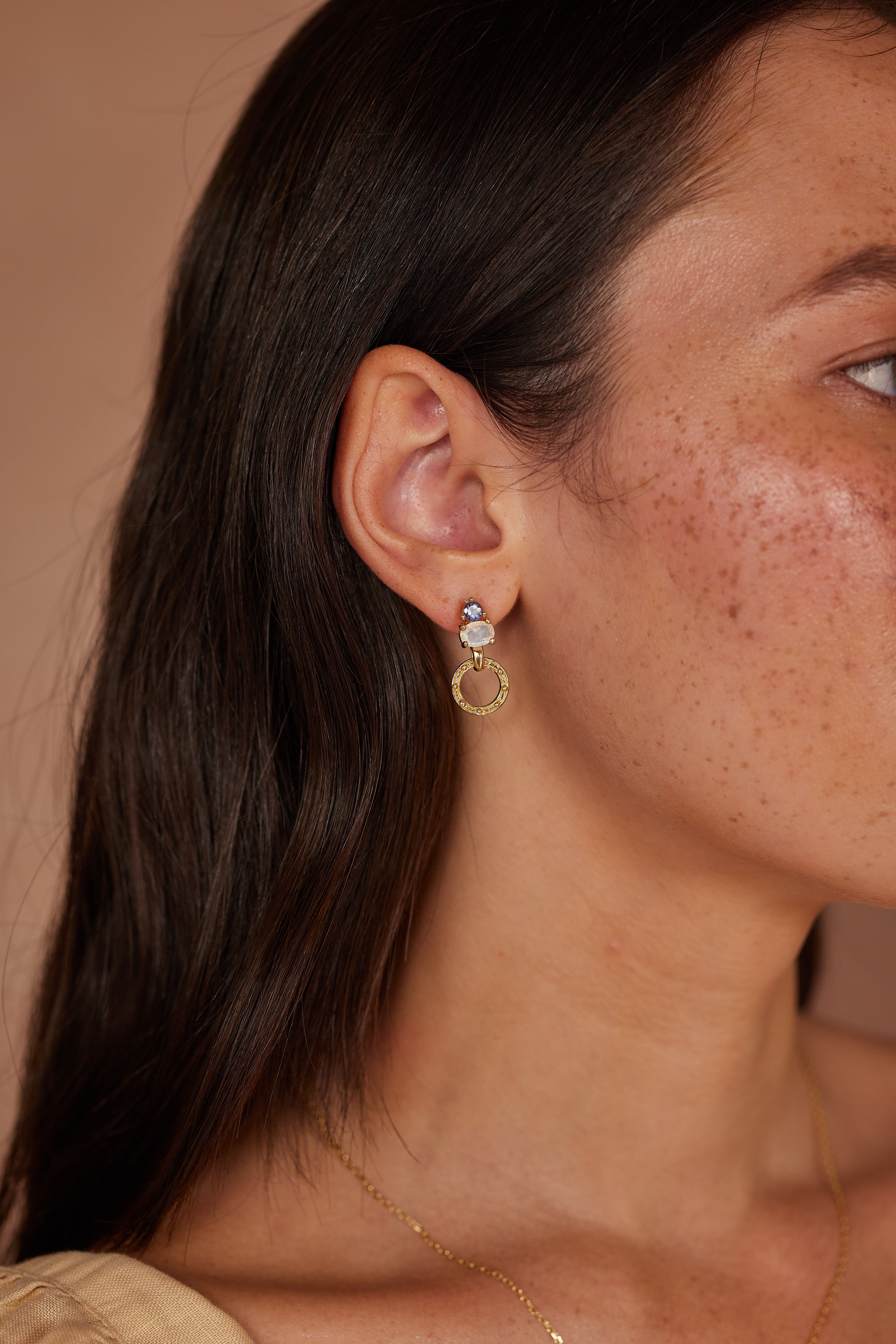 The Raaya Earrings are a balance of rich hues and artisanal textures, designed to stand out. A deep Iolite and glowing Moonstone sit above a beautifully textured ring, where fine line and dotwork add a handcrafted touch.