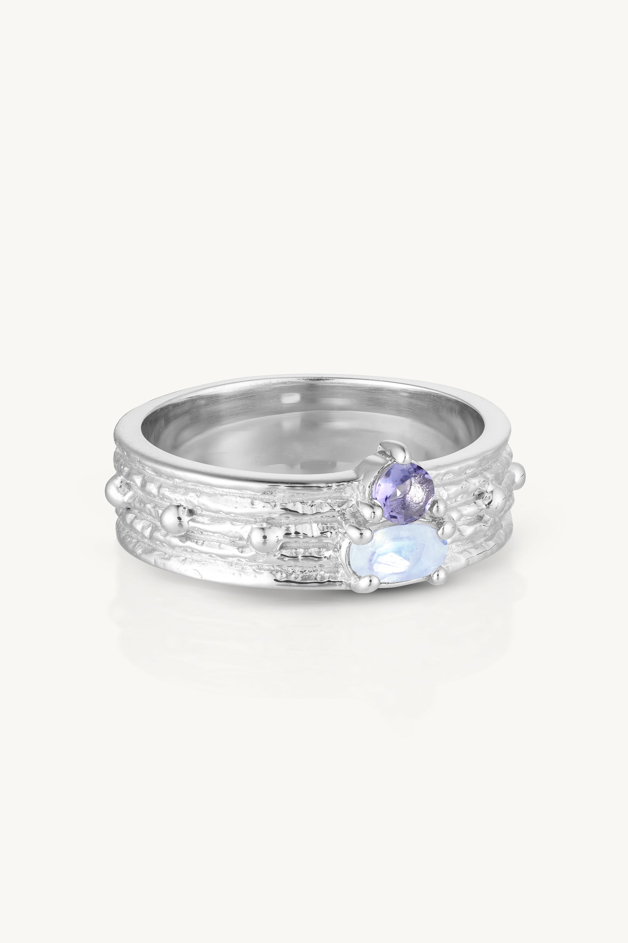 A striking Iolite sits perched atop a luminous Moonstone, with intricate fine line and dotwork that wraps around the textured band.