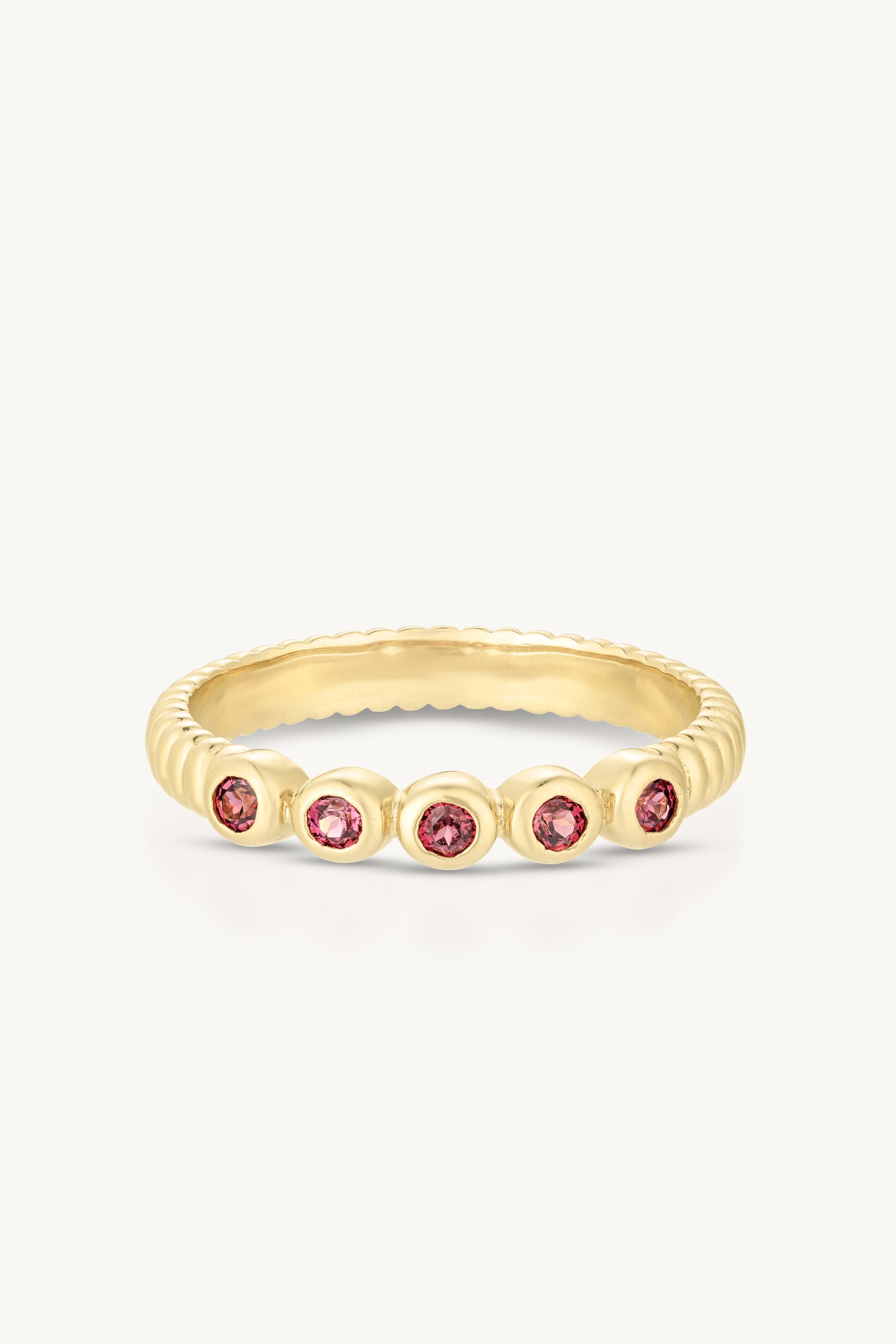 The Binded Stacker featured 5 stunning petite natural handcut stones. The stones are bezel set at the front of the band with delicate ridged detail encompassing the ring.