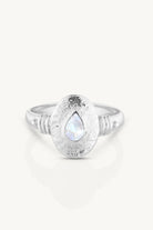Our Esme ring features a stunning hand cut pear stone set into a delicate hand hammered distressed shield with banded detail on it's side.