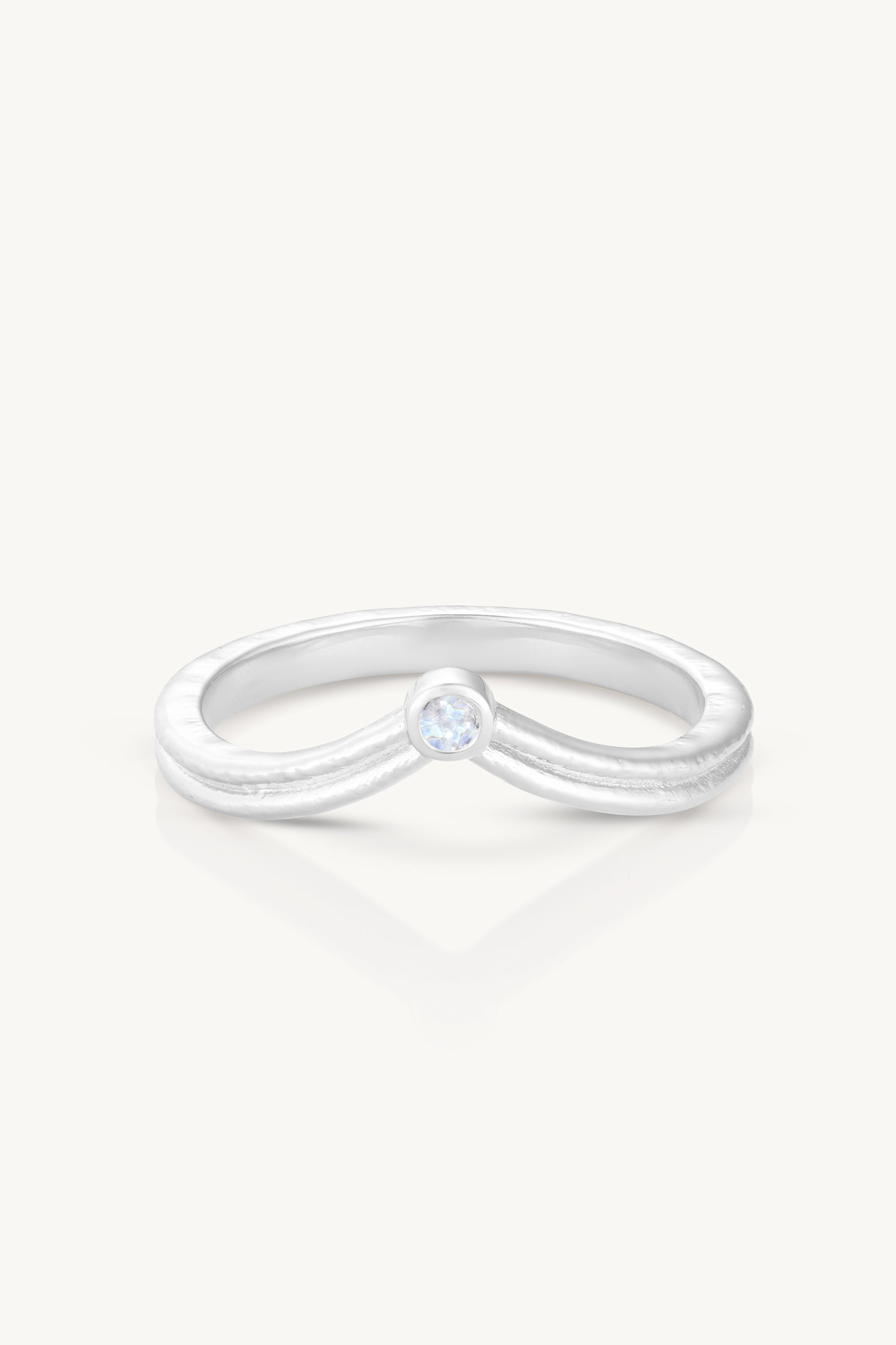 The Crown Stacking Ring features a sweeping double-band silhouette that curves gently to spotlight a bezel-set Moonstone at its centre.