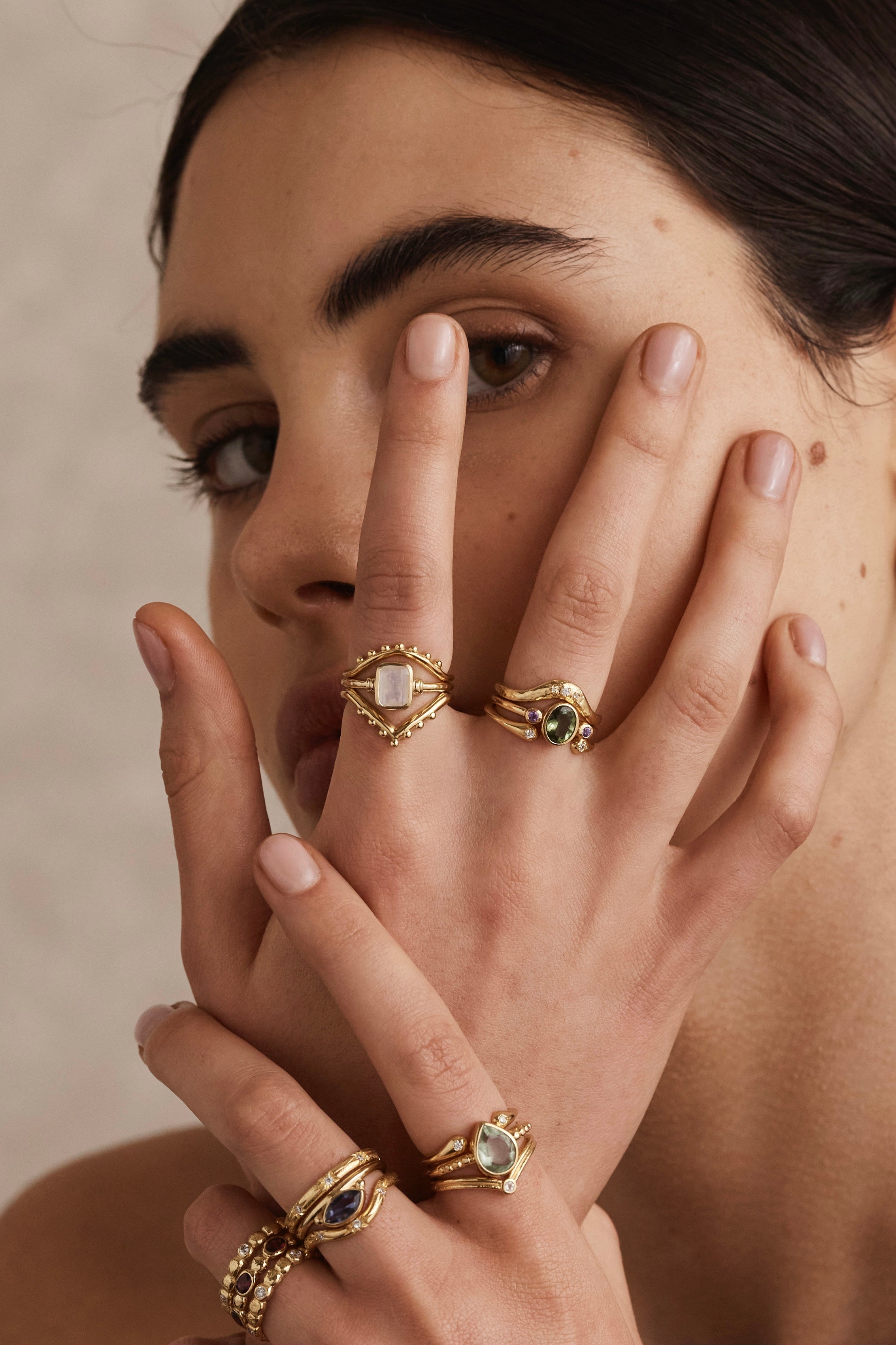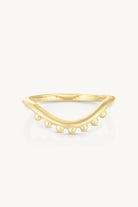 The Noble Crescent Stacking Ring features a crown of delicate ball details across the band. Designed to stack seamlessly with your other treasures, it adds a regal touch to any look.