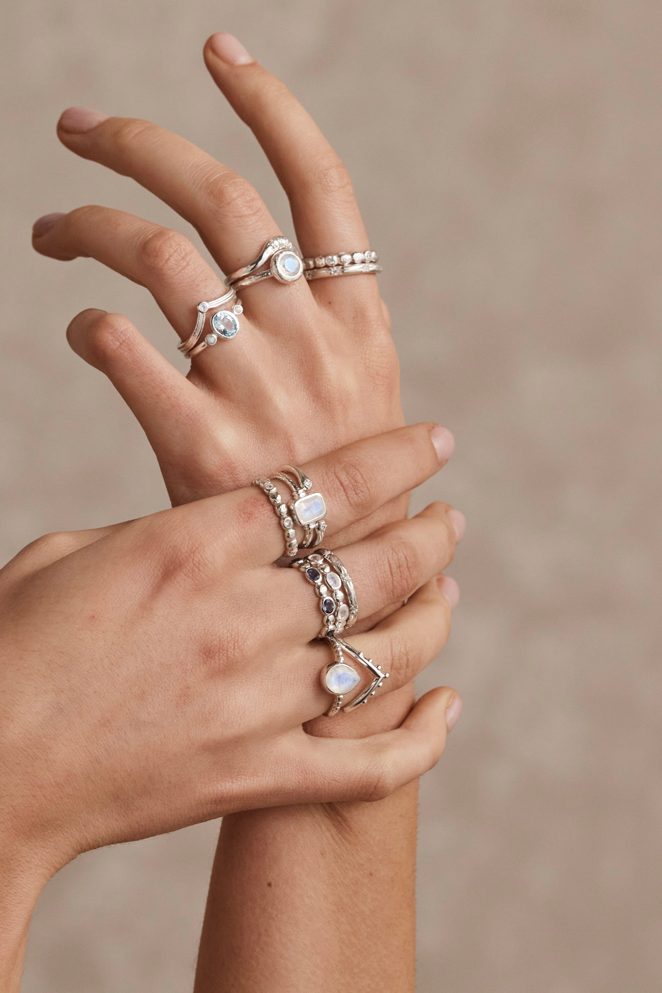 With a bezel-set baguette Moonstone shining front and centre, framed by delicate linework on either side, it’s a band that stands beautifully on its own - but thrives in the company of a good stack.