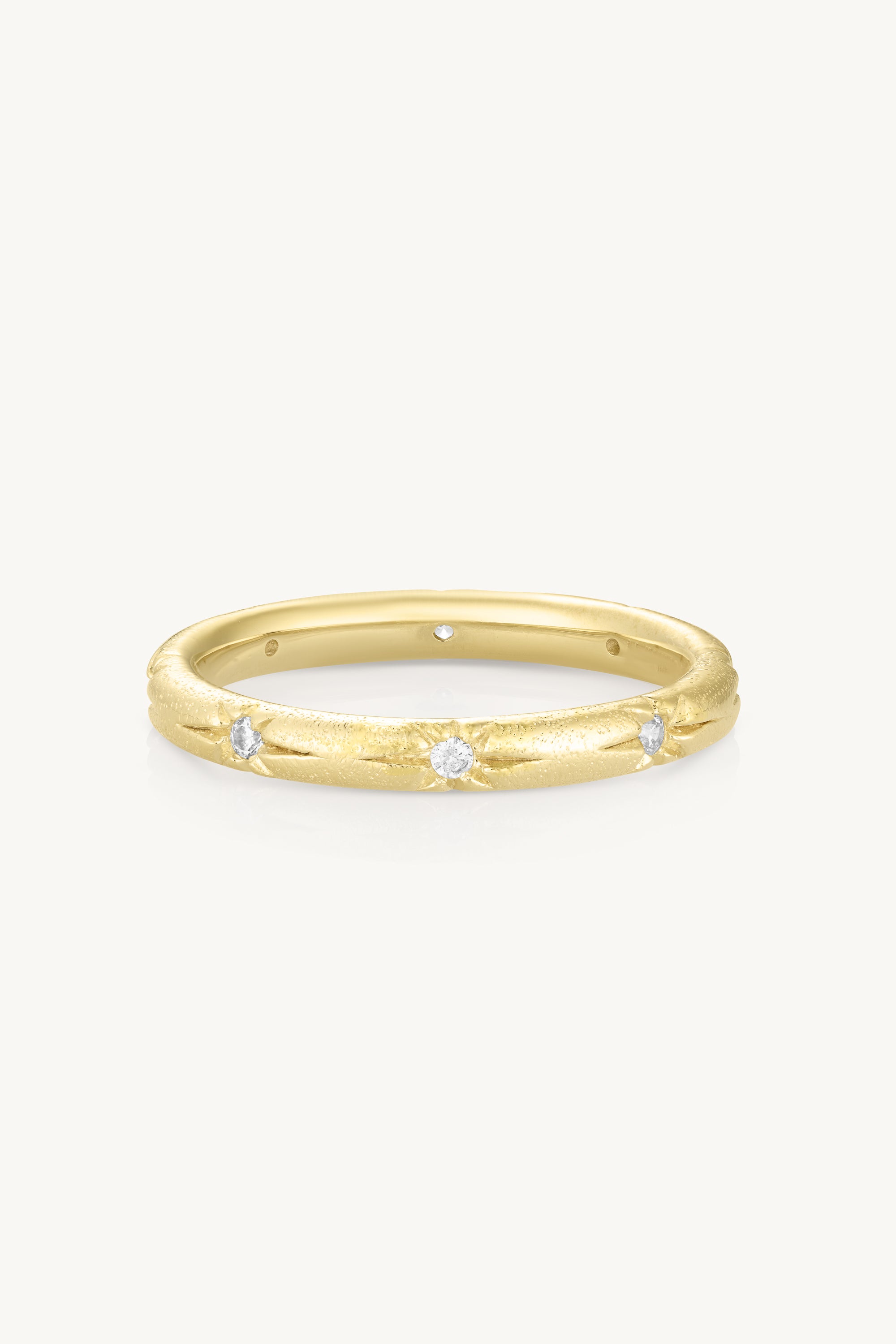 The Starburst Stacking Band features starbursts etched around the full diameter, each set with a glimmering Cubic Zirconia at its heart. Designed to mix, match, and layer with your favourites from our stacking range - wear it solo for subtle sparkle or build your dream stack around it.