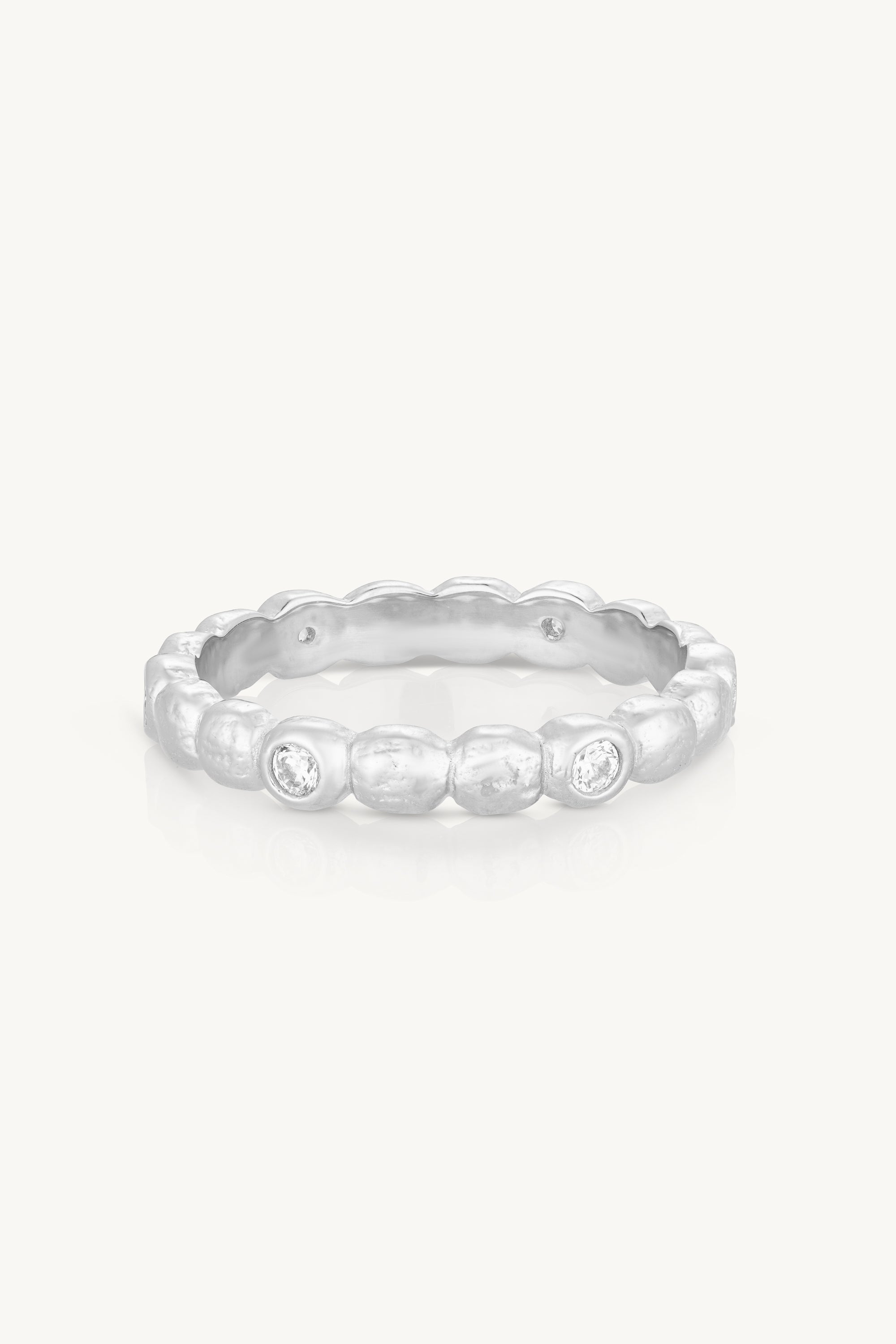 With an organically shaped, textured band dotted with six bezel-set Cubic Zirconias, the Stevie Stacker is made to move with you - a ring for dreamers, wanderers, and lovers of a good stack.
