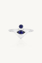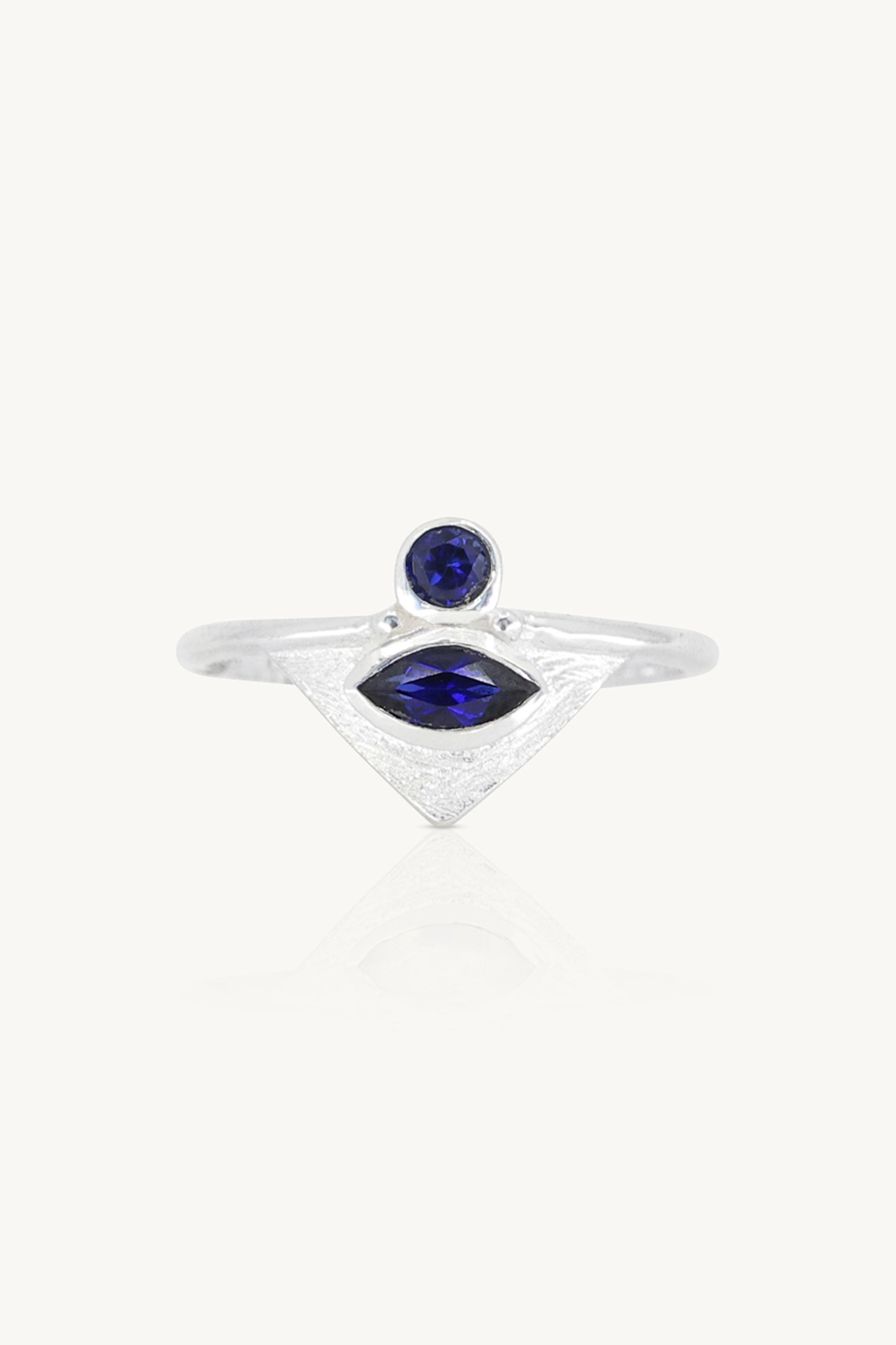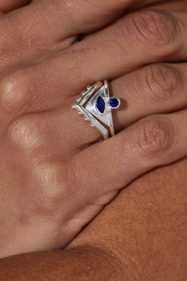 The Nile Stacking Ring is a unique stacking band set with two luminous hand cut faceted semi precious stones with a brushed finish on the pyramid base.