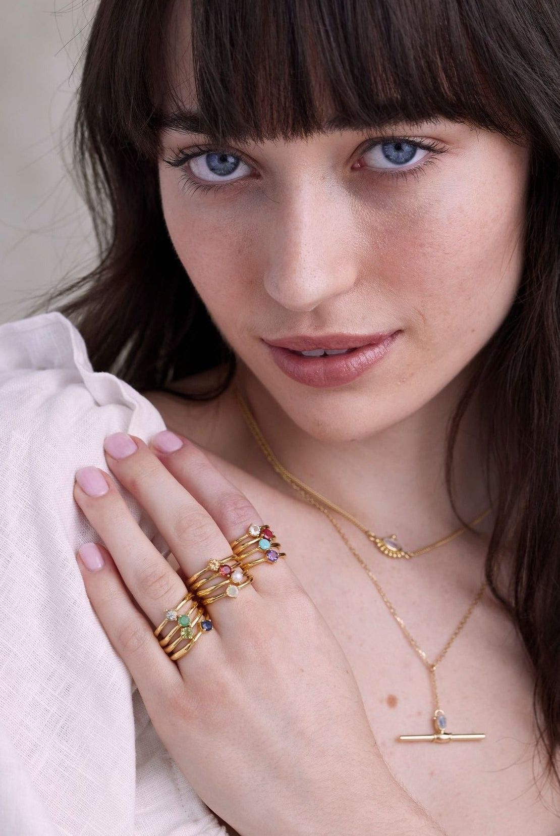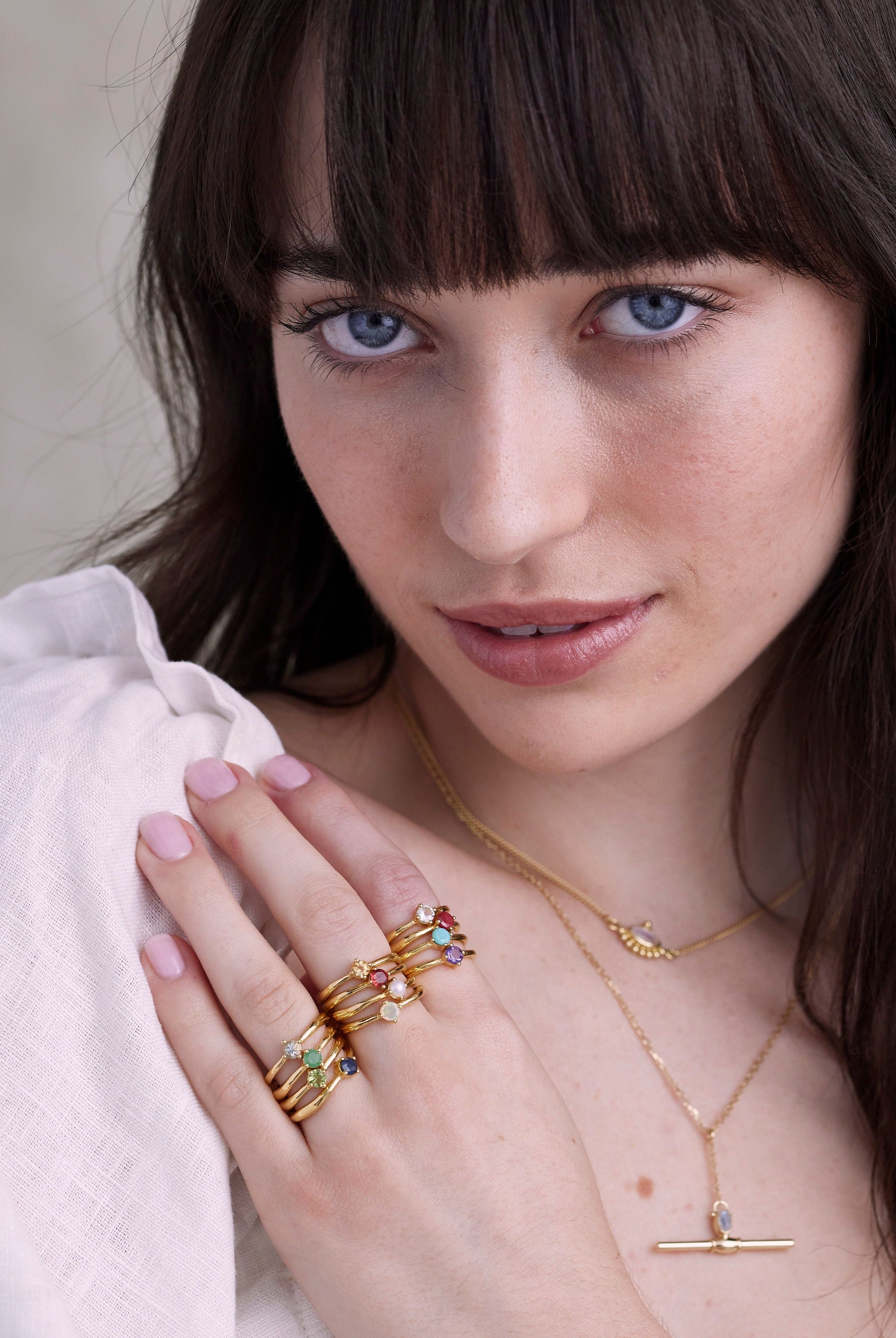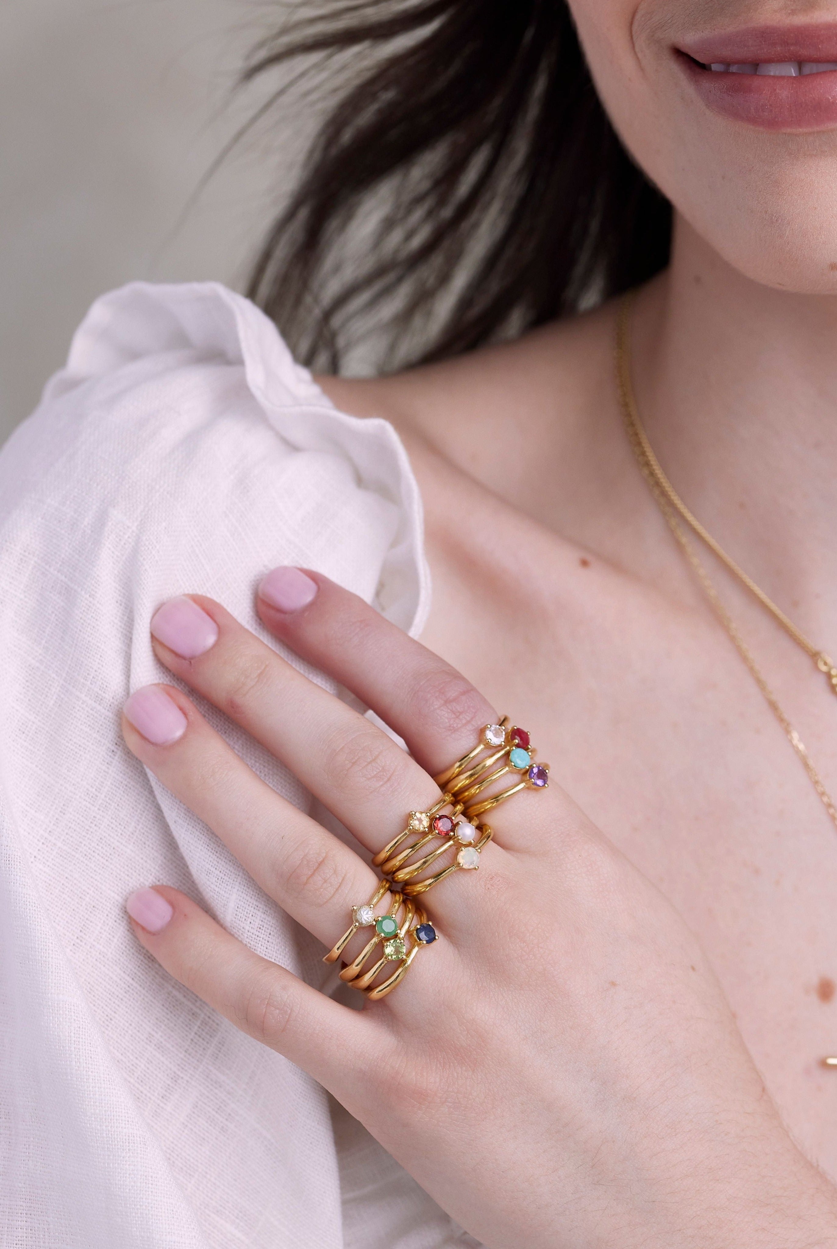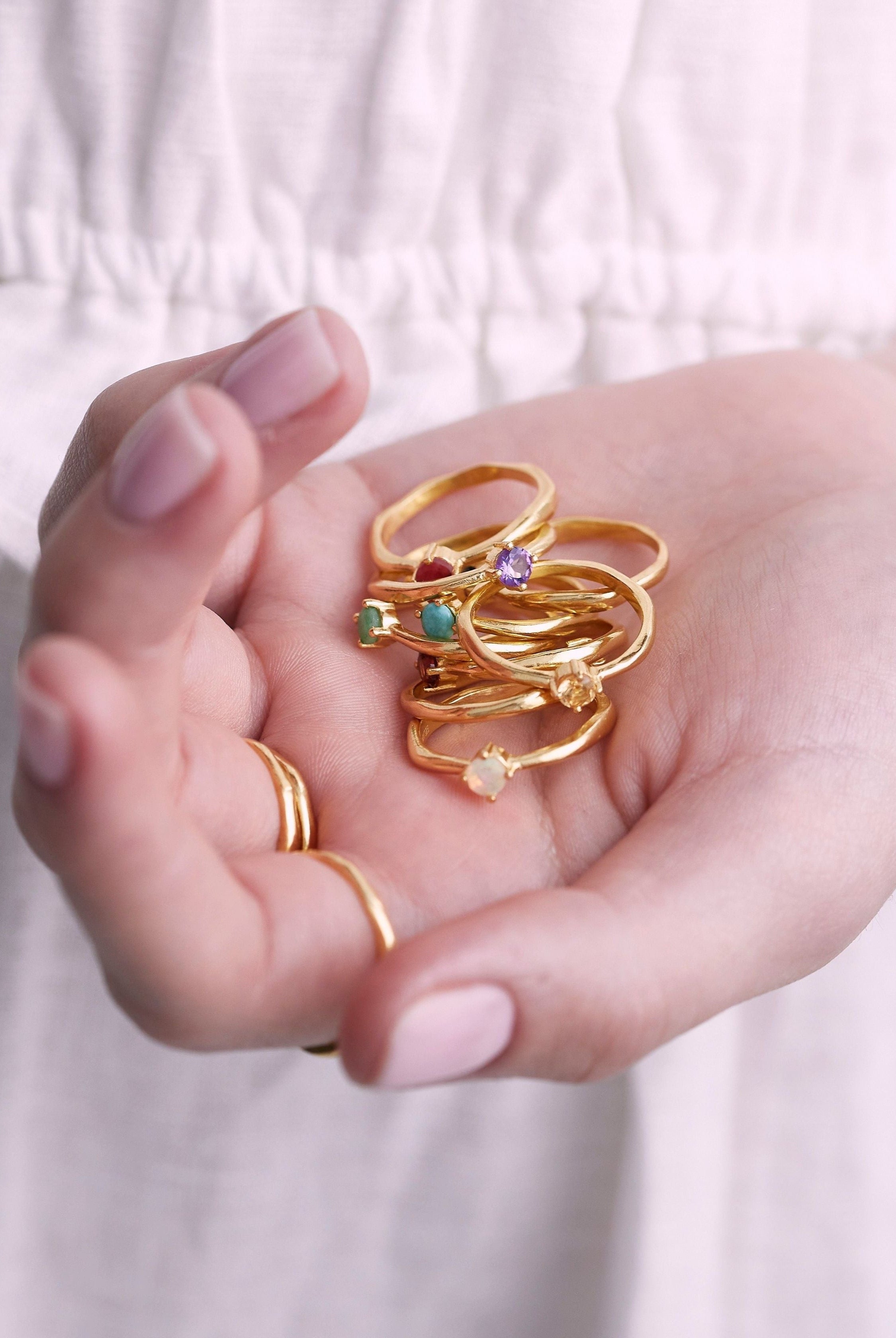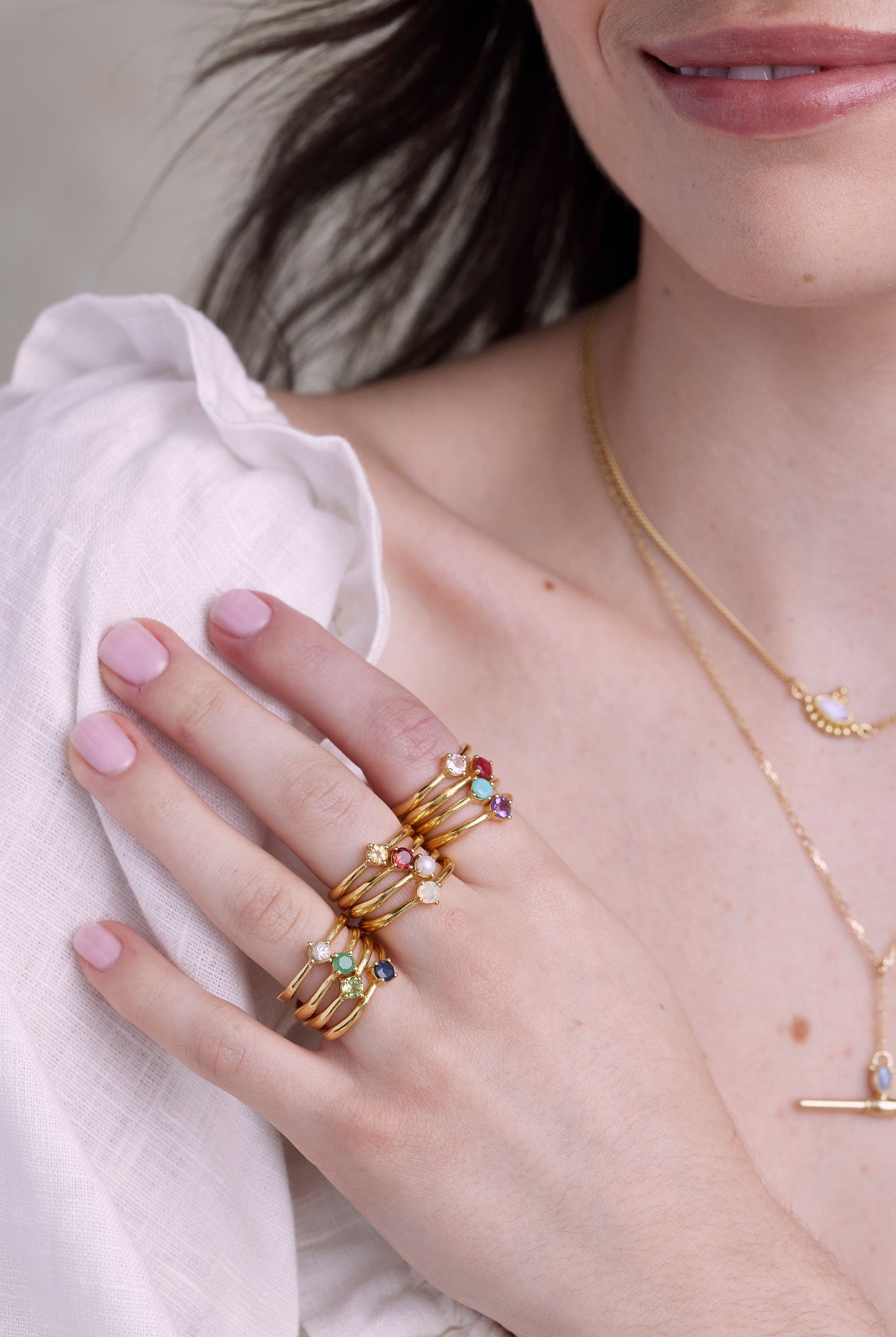 Discover stacking rings and statement designs crafted with sterling silver, gold plating, and semi-precious stones. Perfect for layering and any occasion.
