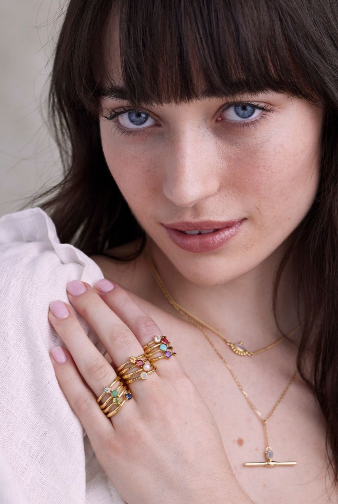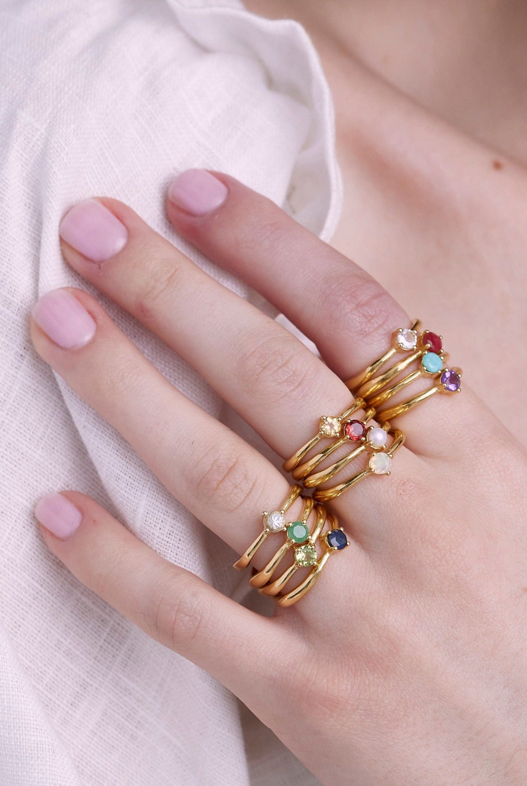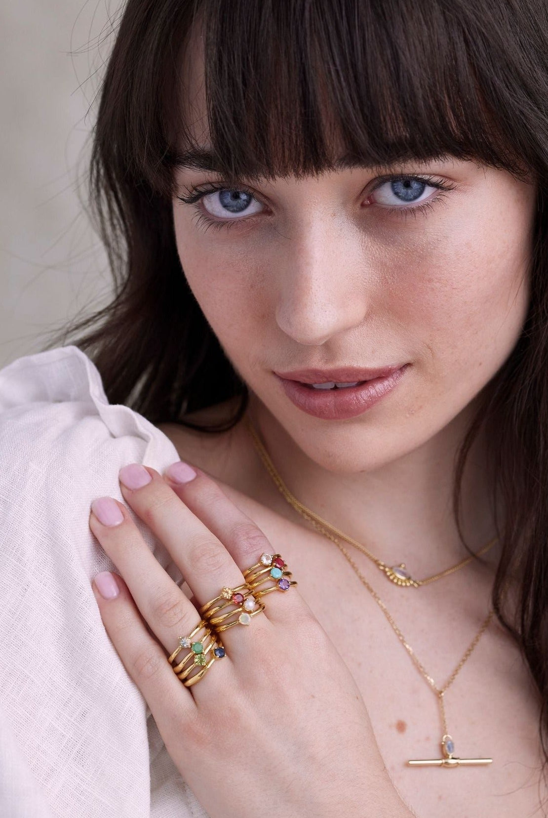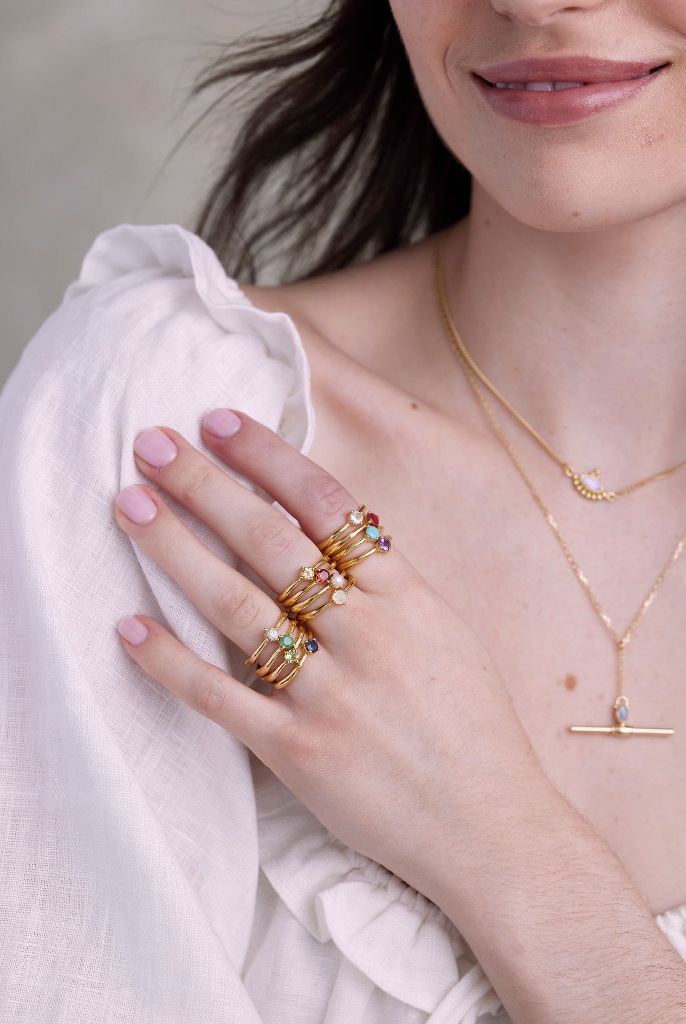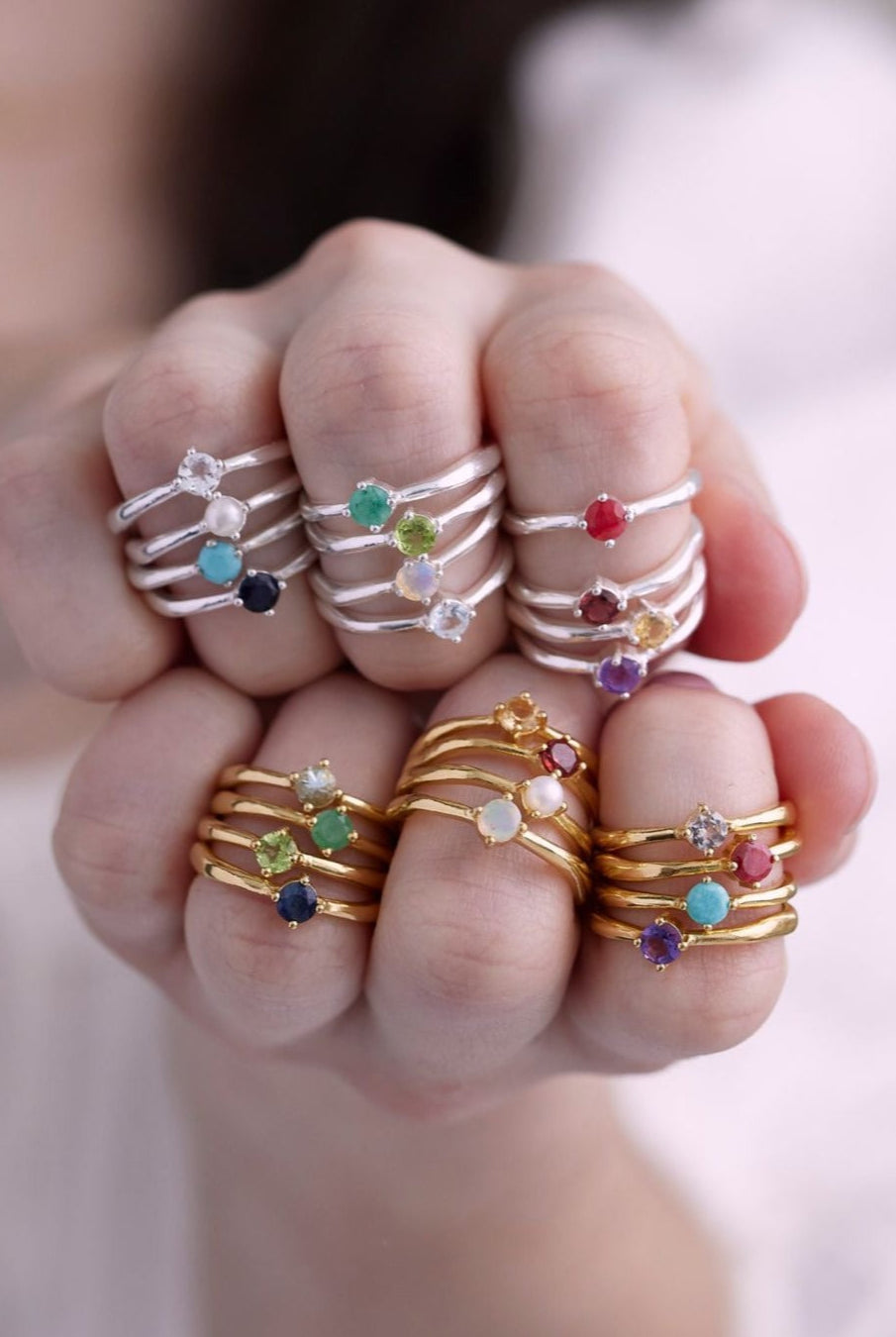 Discover stacking rings and statement designs crafted with sterling silver, gold plating, and semi-precious stones. Perfect for layering and any occasion.