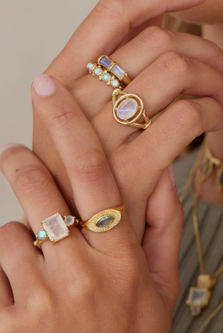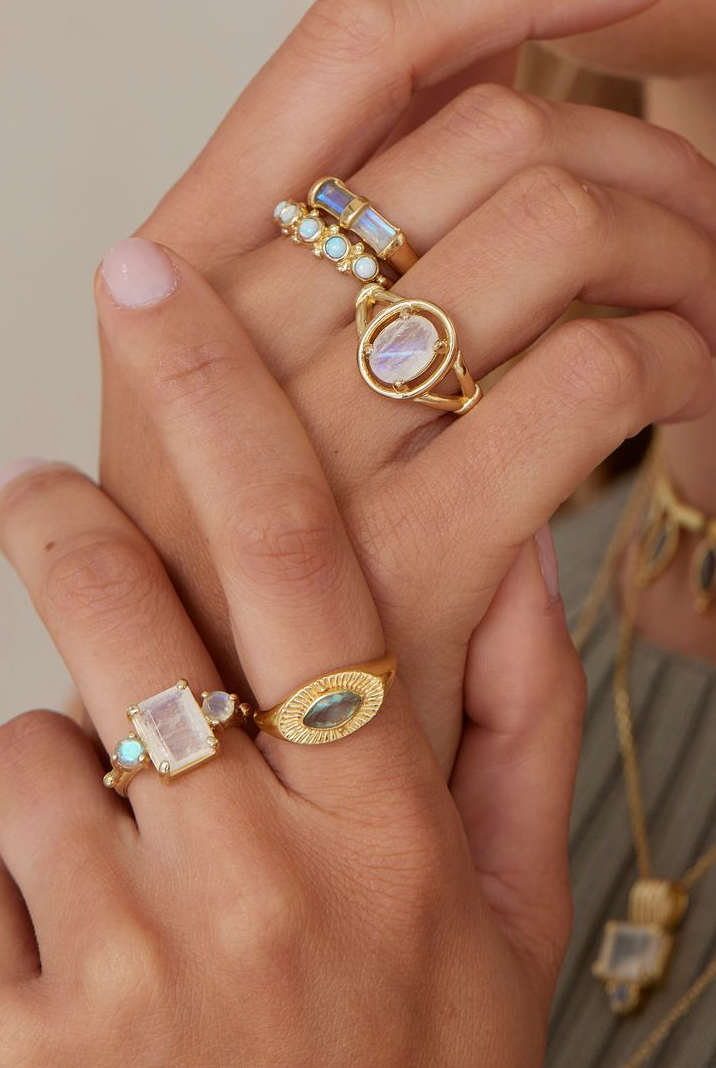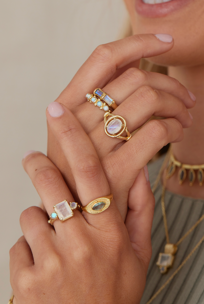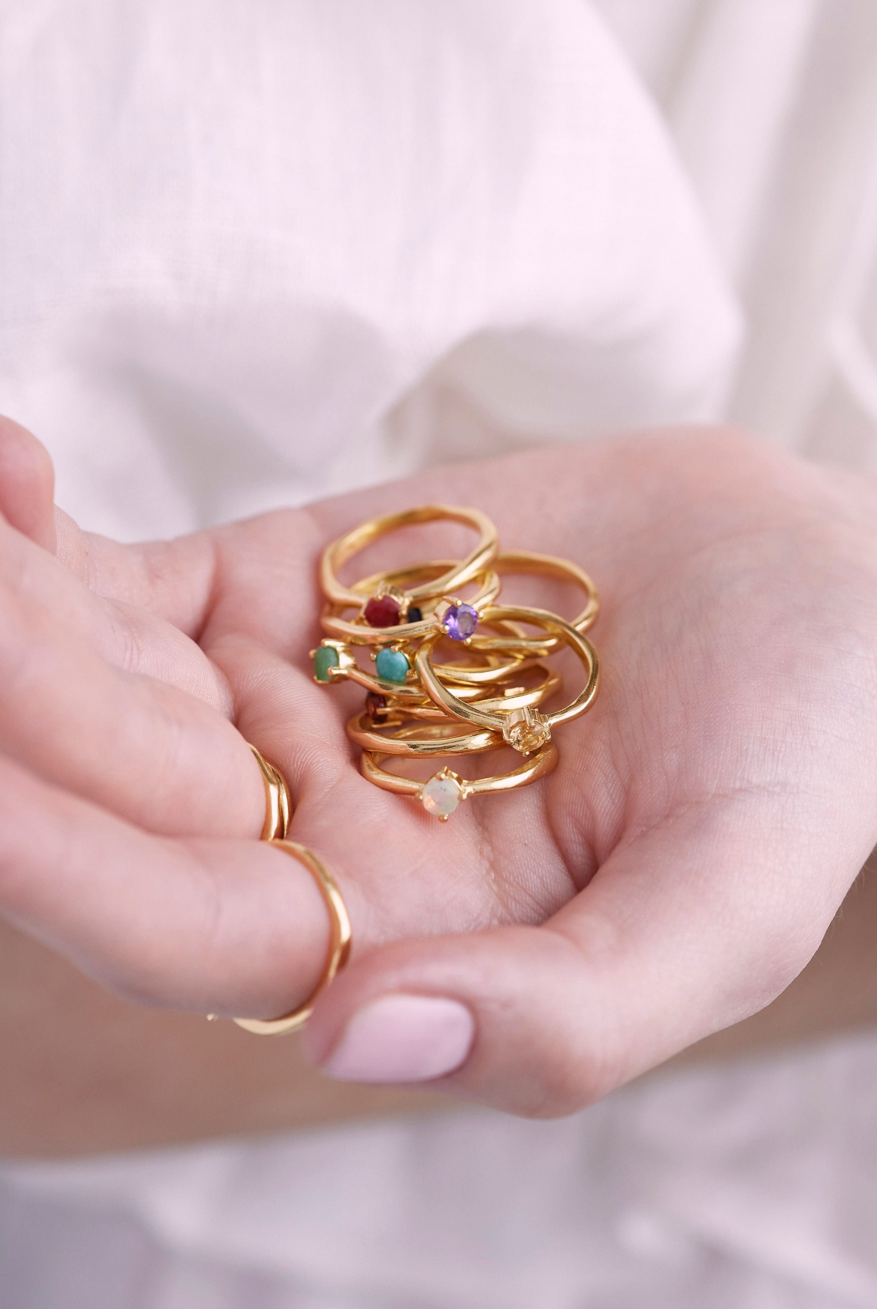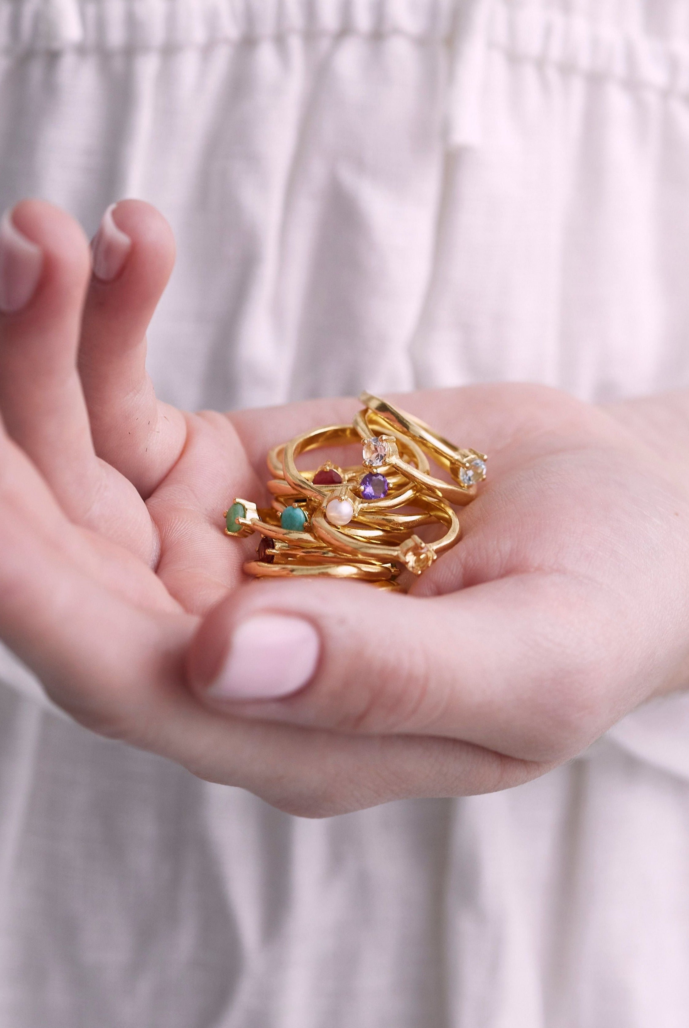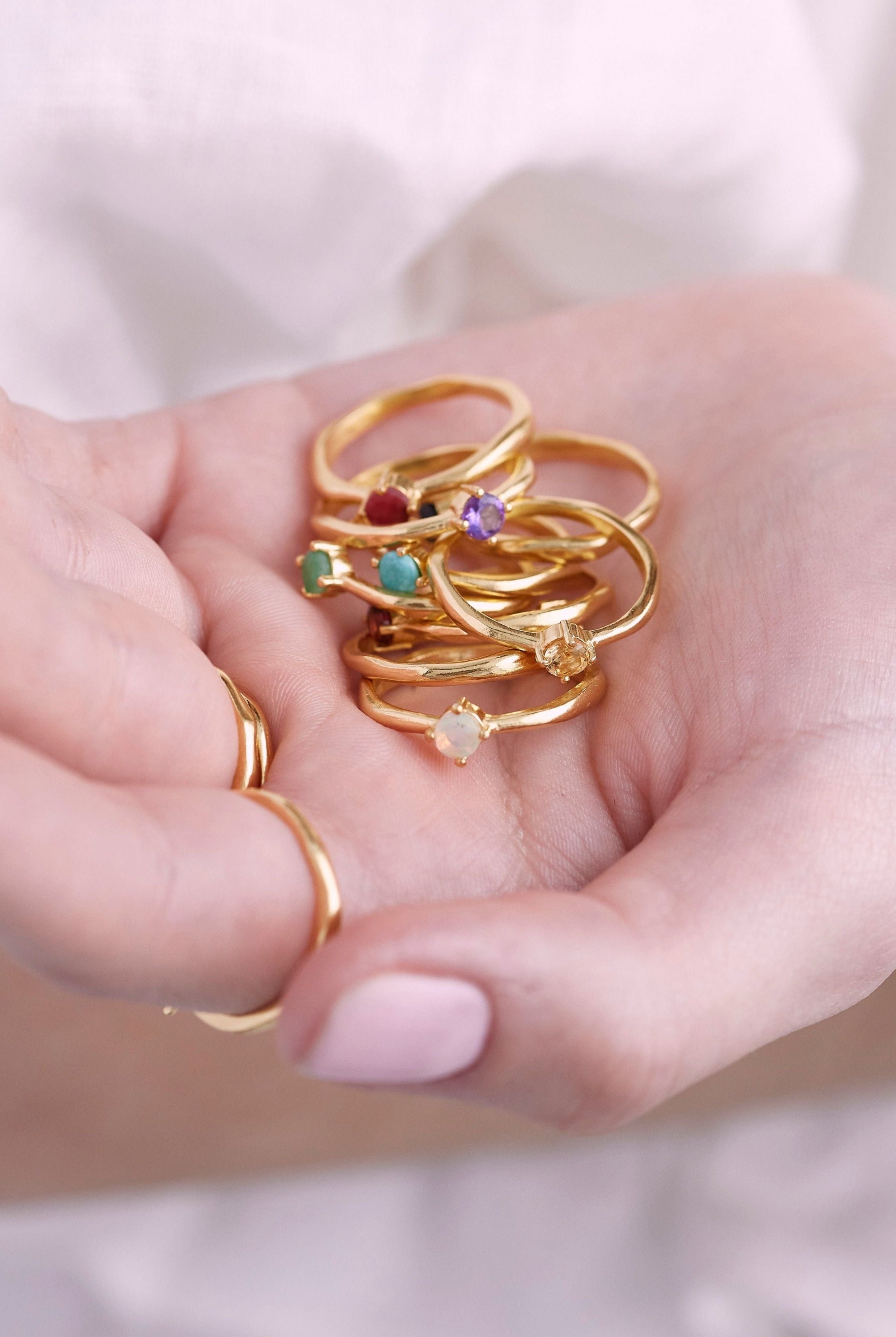 Discover stacking rings and statement designs crafted with sterling silver, gold plating, and semi-precious stones. Perfect for layering and any occasion.