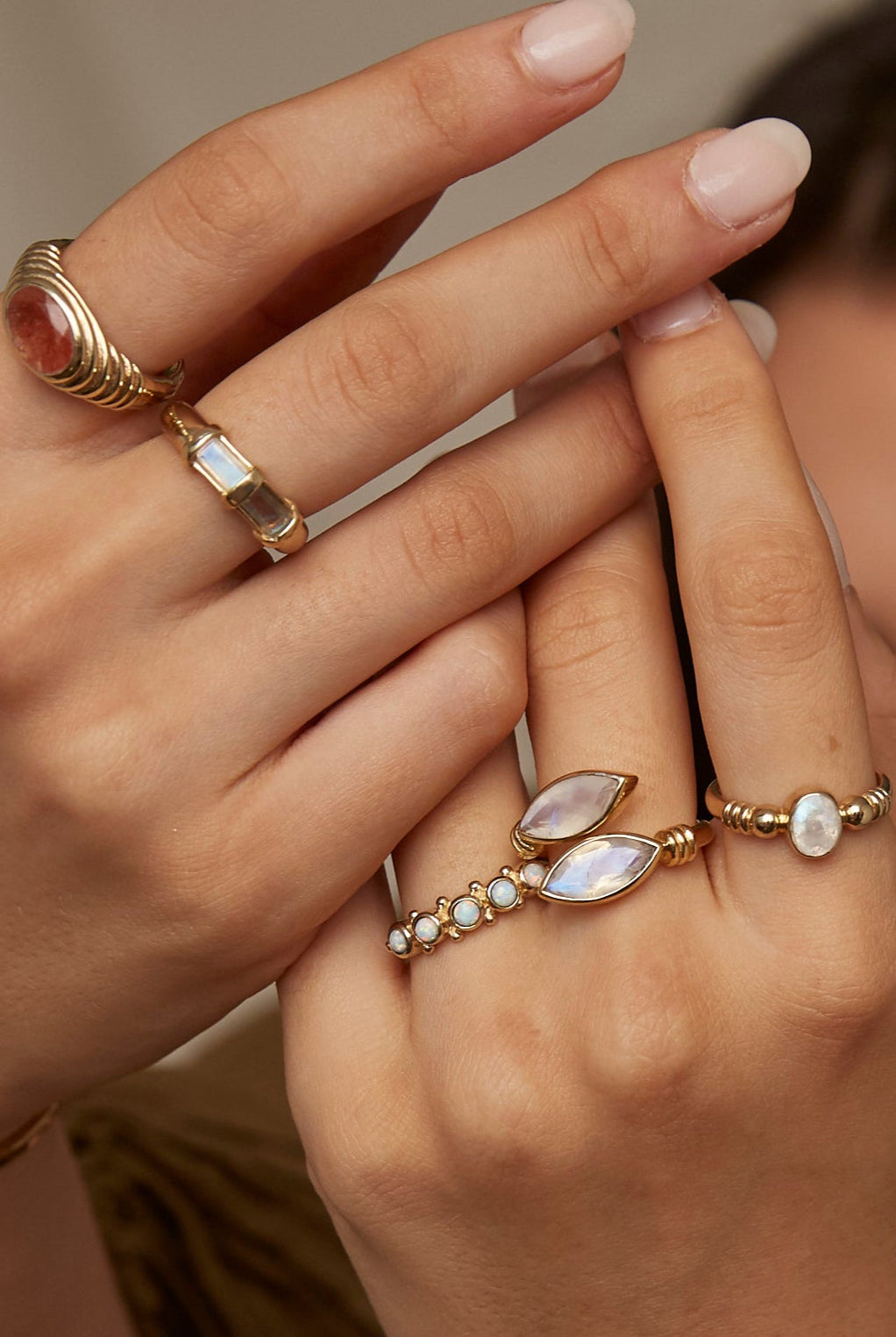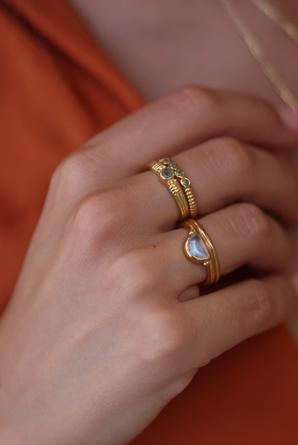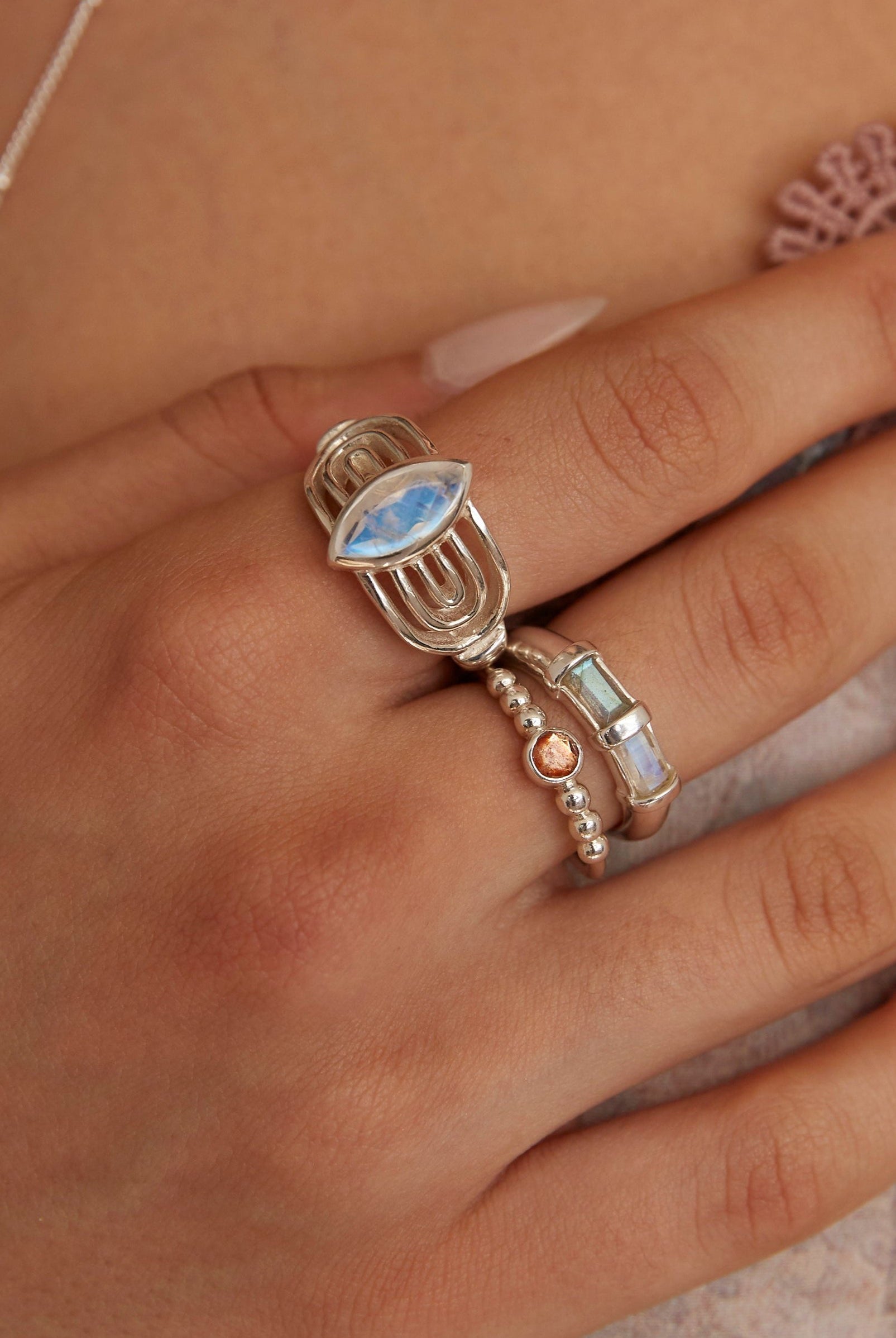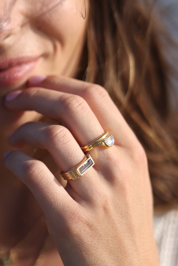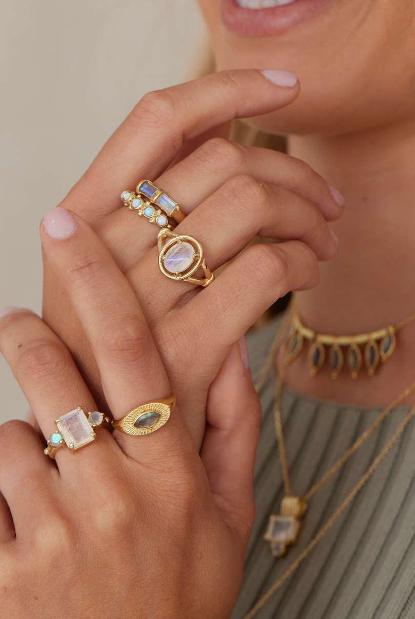 Discover stacking rings and statement designs crafted with sterling silver, gold plating, and semi-precious stones. Perfect for layering and any occasion.