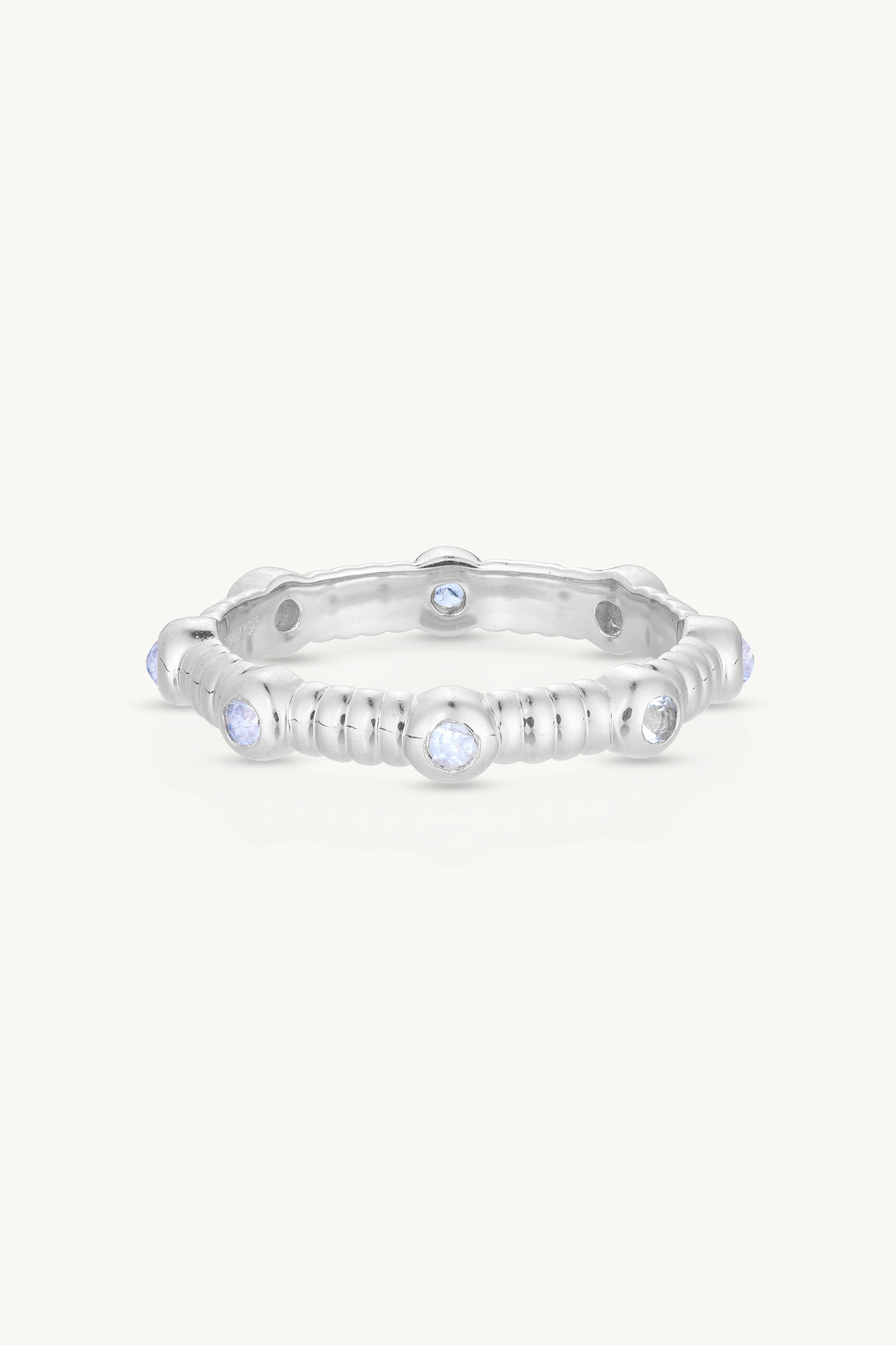 The Asymmetric stacker features 9 stunning petite natural handcut stones. The stones are bezel set around the ring with delicate ridged detail alternating around the ring.