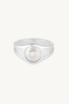 The Athens Signet is designed to be a shield of protection and strength. Featuring a raised highly polished edge, the band is contrasted by submerged textured sections across the ring. Set with a hand cut rainbow moonstone in its centre, the stone of new beginnings.