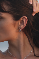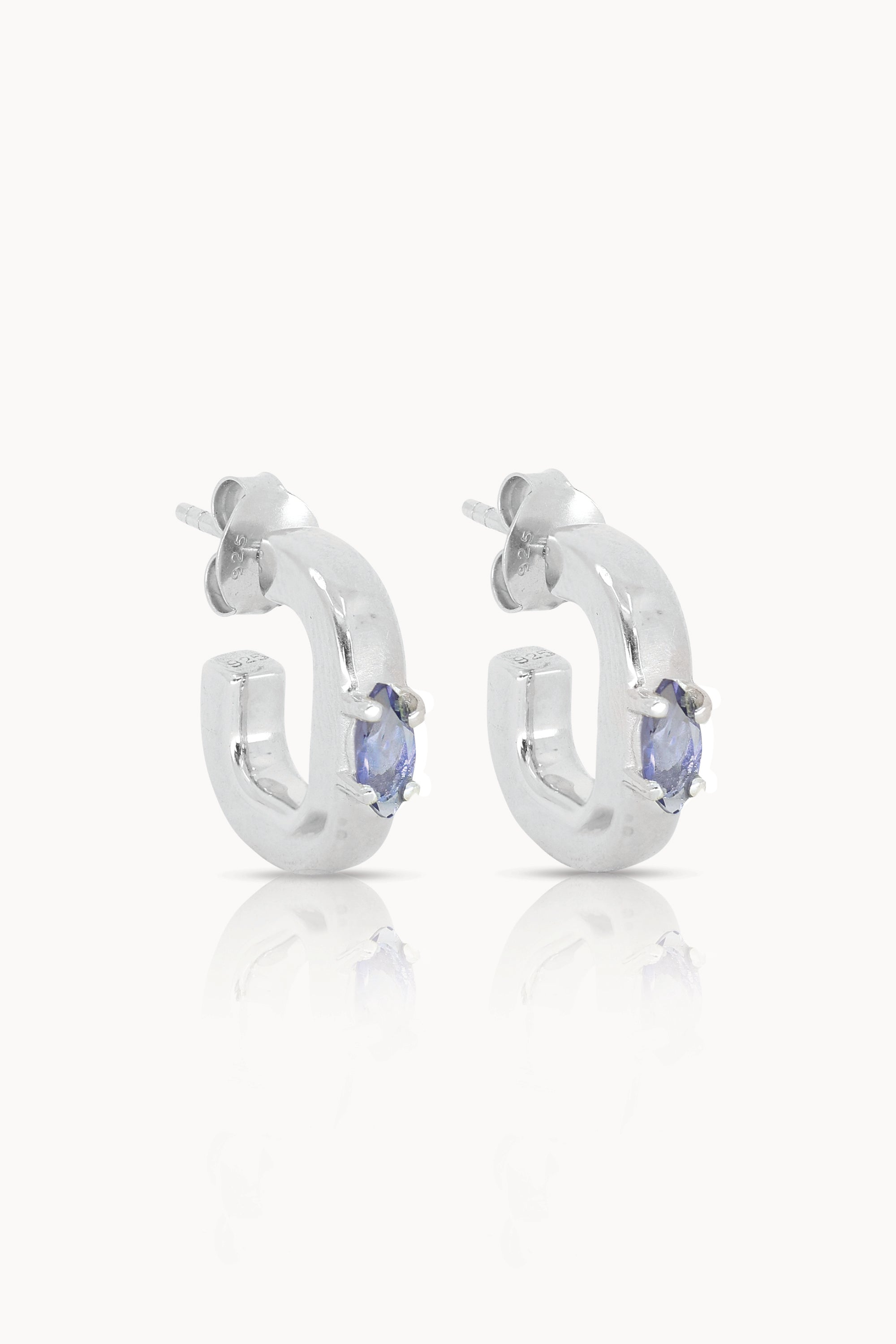 The Elodie Hoops are a curved thick oval hoop with baby marquise stone claw set into the very front of the hoop. They are a high polished hoop with stud backing.