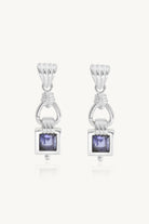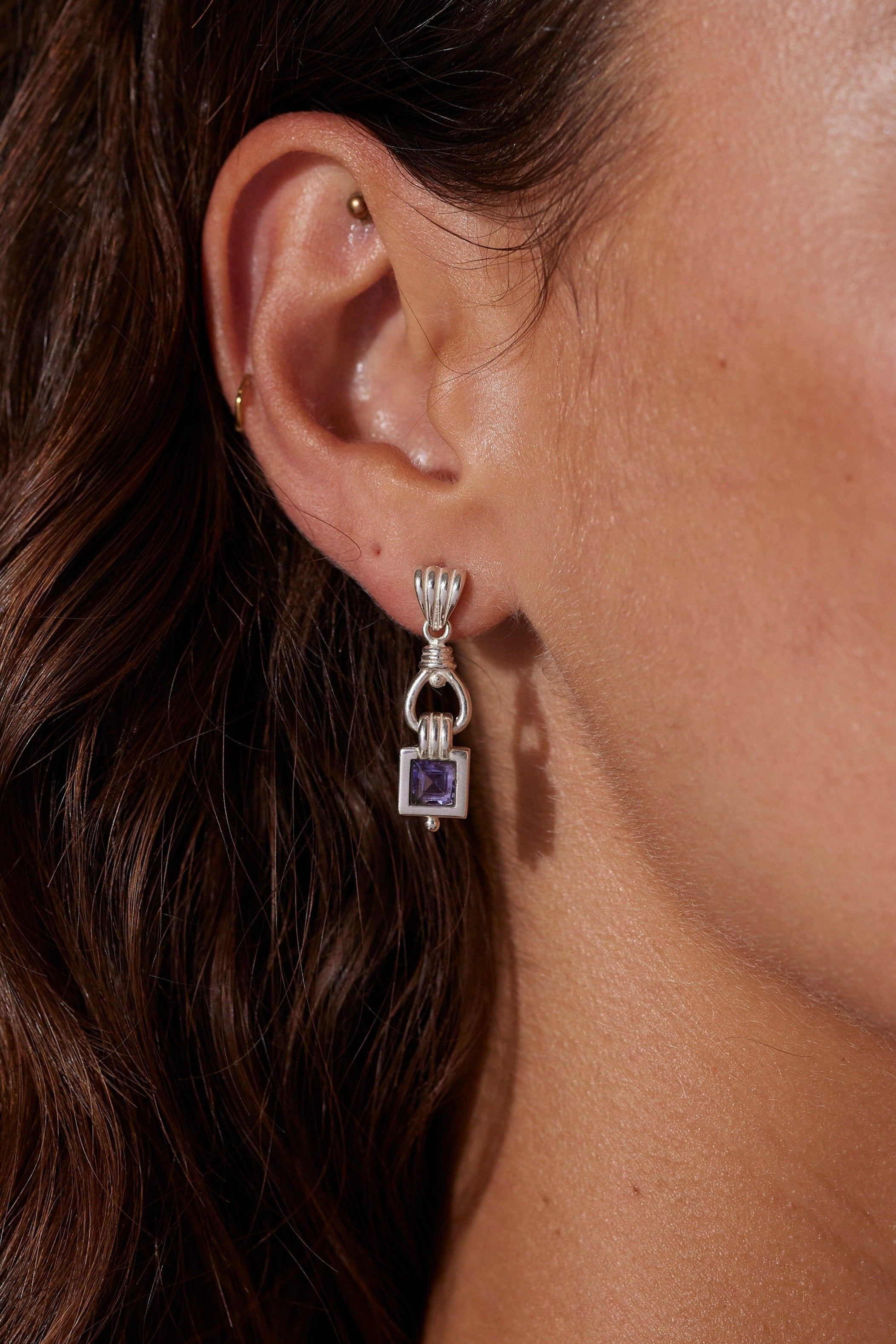 The Freya Earrings features a large square baguette cut Iolite stone with a heavy bezel setting. The stone swings from rope detailing that loops and forms to make the the top of the earring, with fan detail on the stud.