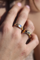 The Freya Ring features a large square baguette cut rainbow Moonstone with a heavy bezel setting. The bezel of the ring is held in place by rope detailing that loops and forms to make the band of the ring with delicate ridged detailing on each side.