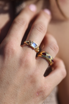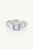 The Freya Ring features a large square baguette cut rainbow Moonstone with a heavy bezel setting. The bezel of the ring is held in place by rope detailing that loops and forms to make the band of the ring with delicate ridged detailing on each side.