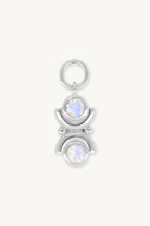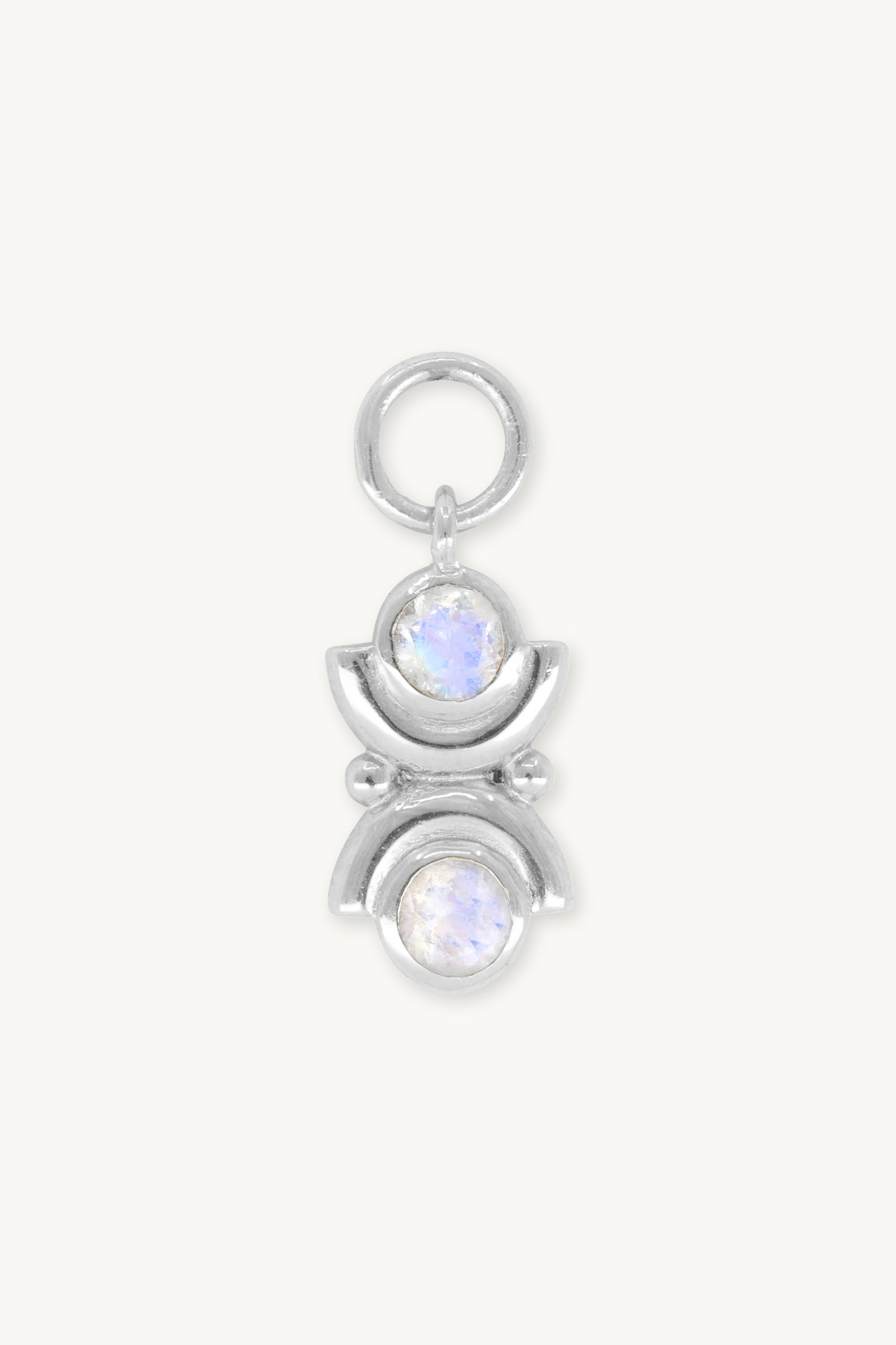 The Lotus Charm featured two stunning stones bezel set and held in a curved moon setting. The charm is available in a Moonstone version and a mixed stone version with Apatite/Iolite (gold) and Rhodolite/Iolite (silver).