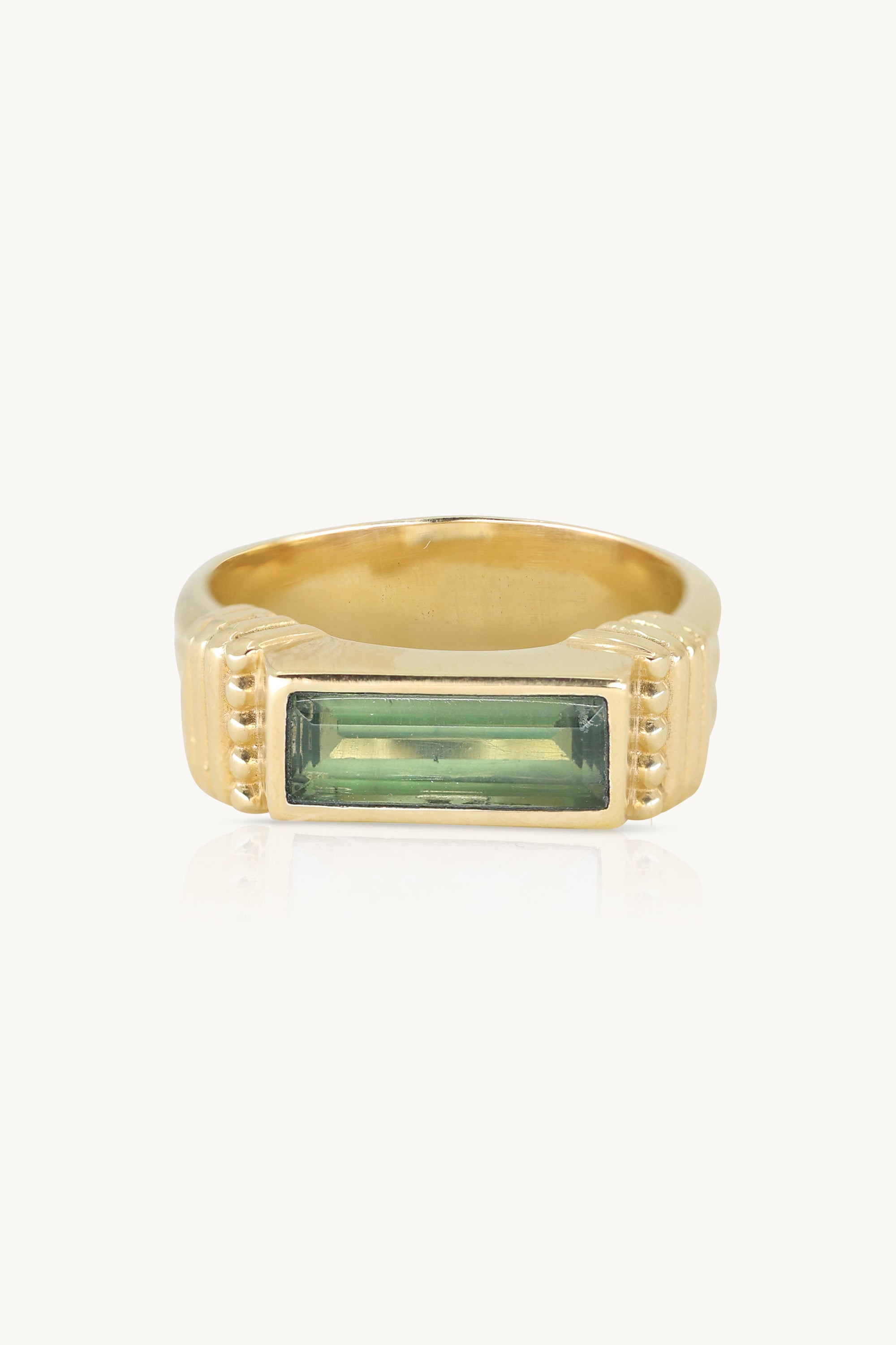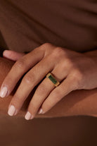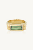 Our Phoebe Ring is a statement ring that features a large baguette hand cut Apatite stone set in a thick bezel with intricate banded detail across the ring. With similar detailing to our Rana band, the band of the ring itself appears as 3 horizontal ribbed bands with vertical detail on either side of the stone.
