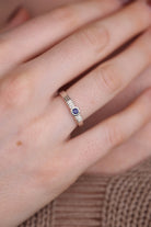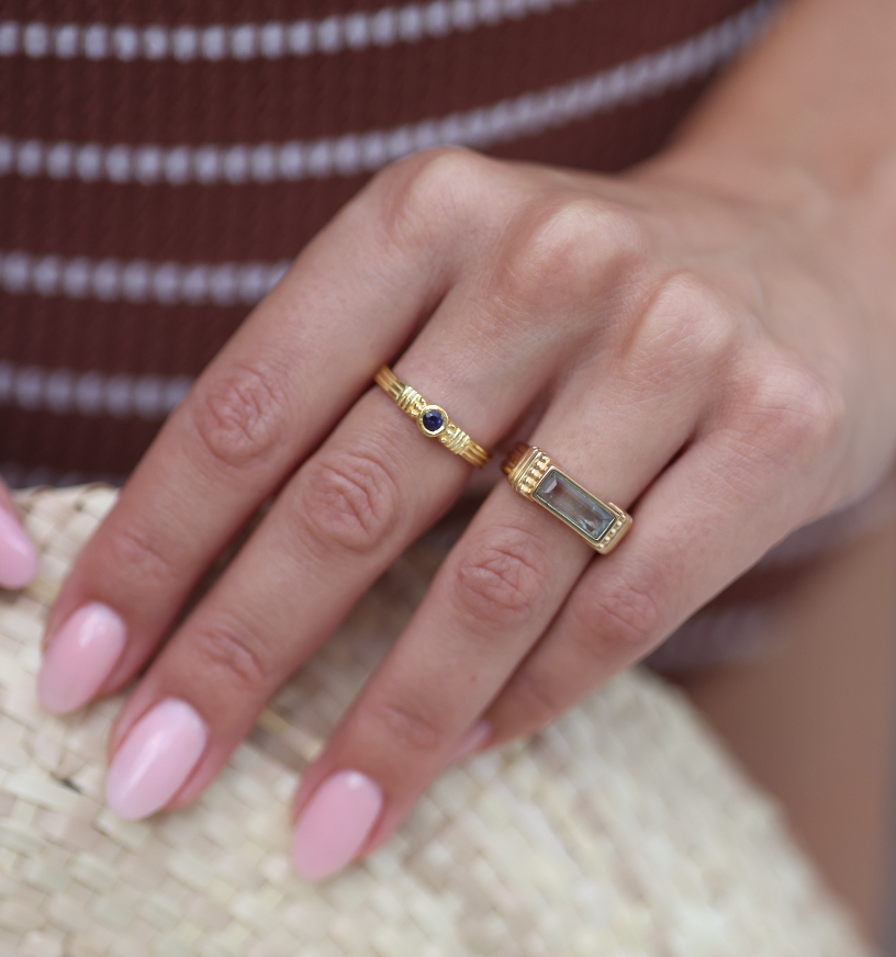 The Rana Ring features a natural hand cut Iolite stone set in a thick bezel with intricate banded detail across the ring. It is the perfect every day piece and can also be worn stacked together. The band of the ring itself appears as 3 horizontal ribbed bands with vertical detail on either side of the stone.