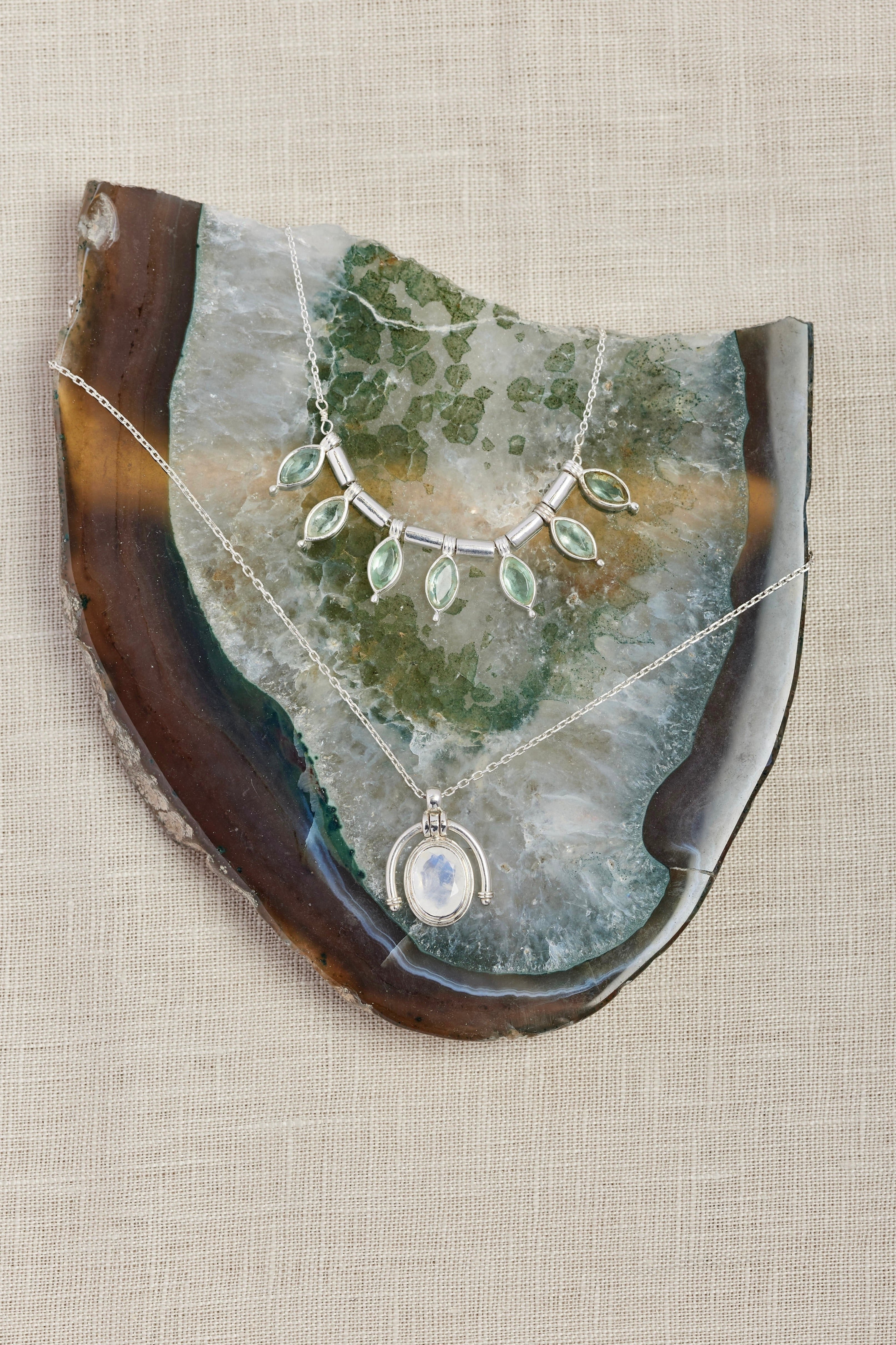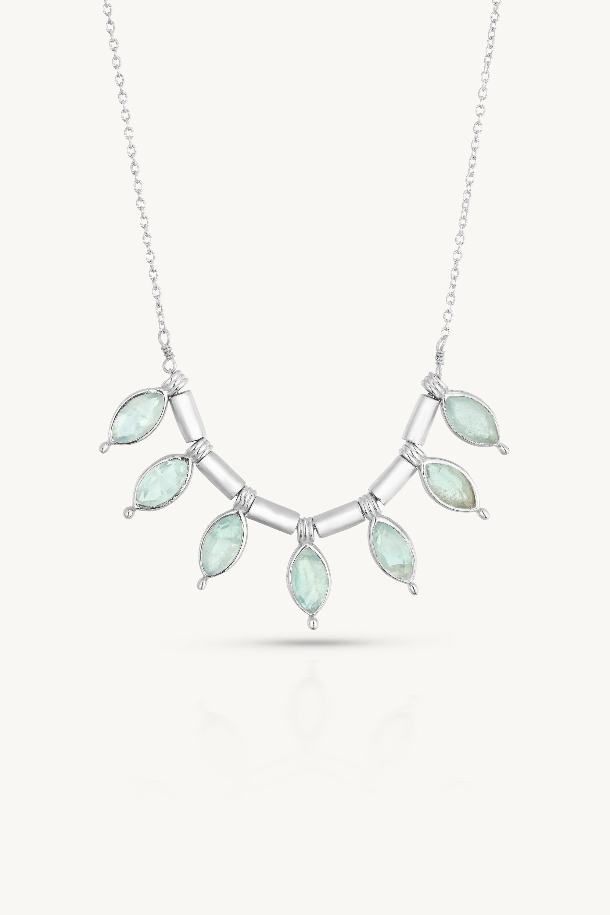 This necklace features a fan of marquise Apatite stones that spread themselves across the décolletage when worn. Spaced between bars of silver this necklace is the perfect statement piece to be worn on it's own or layered.