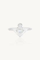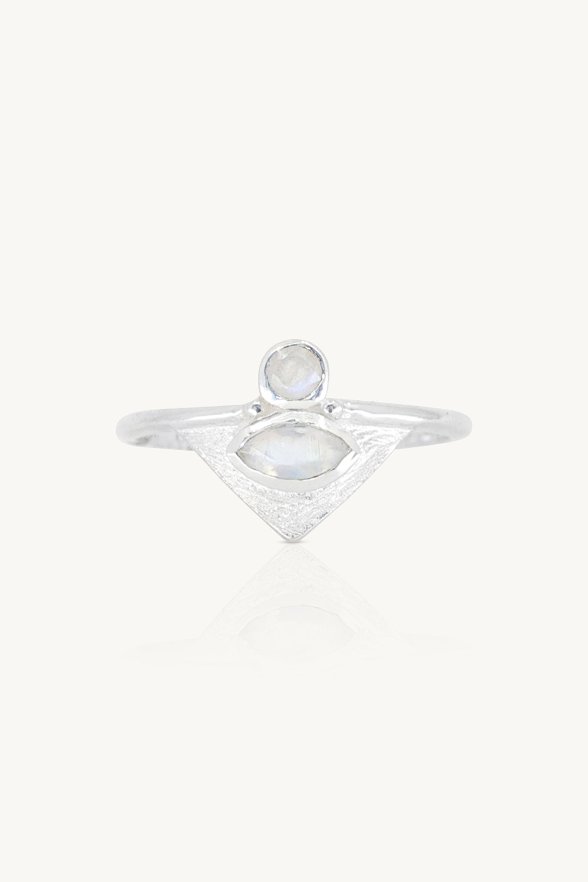 The Nile Stacking Ring is a unique stacking band set with two luminous hand cut faceted semi precious stones with a brushed finish on the pyramid base.