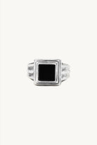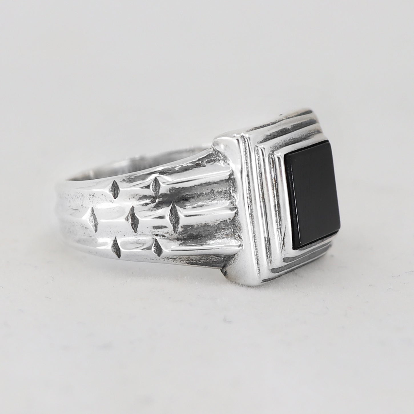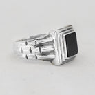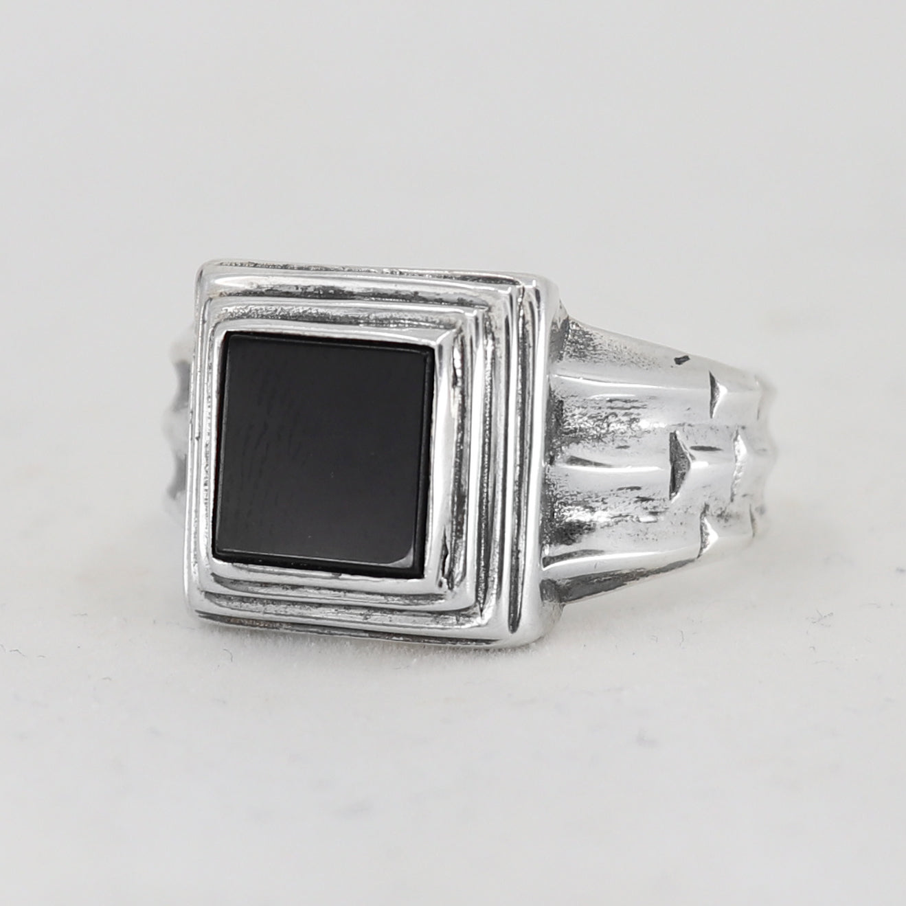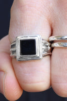 The Inca Onyx is a stunning statement piece. This ring is hand made with sterling silver featuring a Onyx stone. The ring features ornate detailing on each side of the band with the stone set in a stepped bezel.