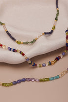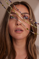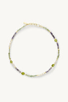 The Wren Beaded Necklace showcases a striking blend of Apatite, Iolite, Peridot, Rose Quartz and Pearl creating a harmony of greens and blues punctuated by softness.