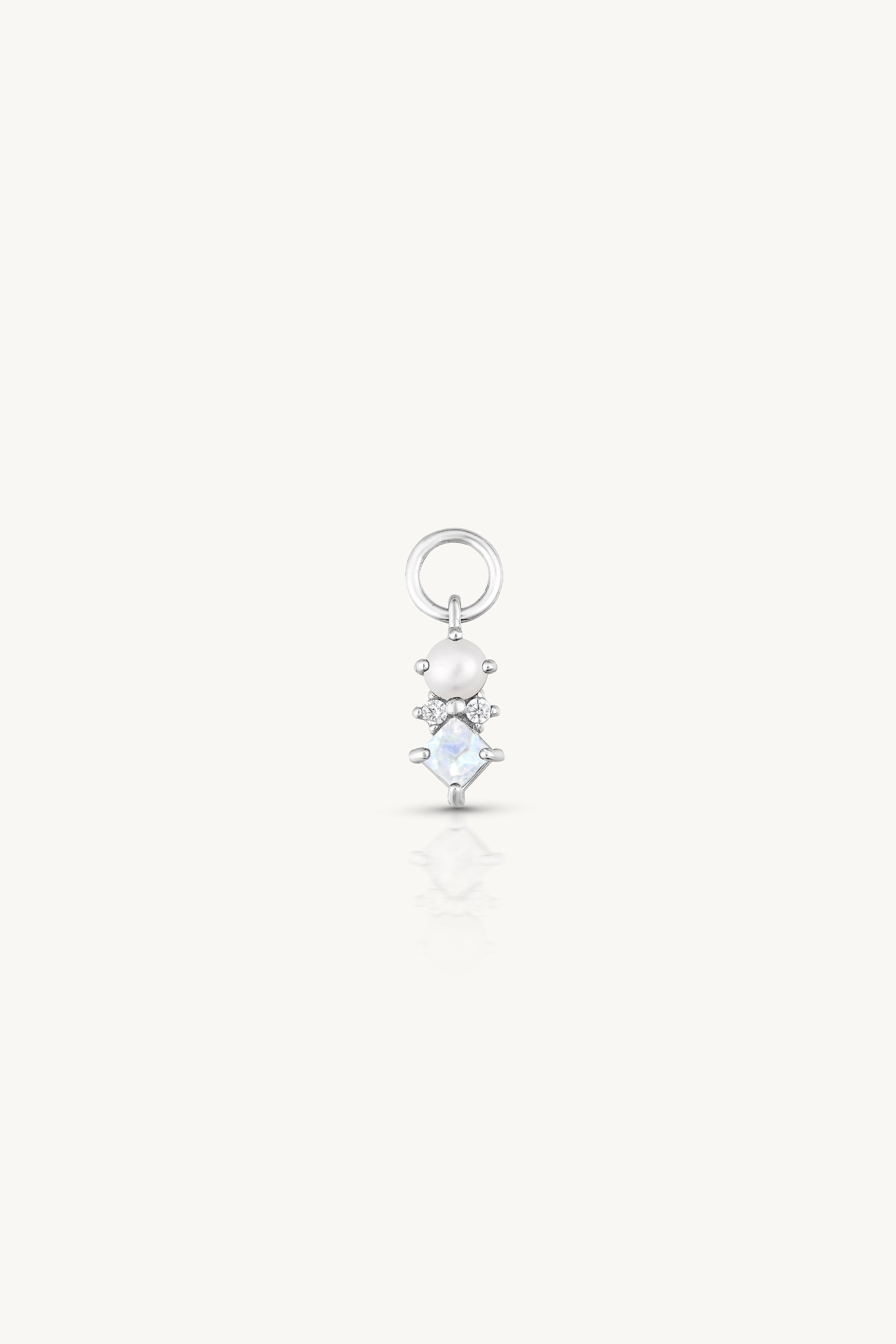 The Farah Charm features an iridescent Pearl, luminous Moonstone and a sparkling Cubic Zirconia, each stone delicately prong set in place.