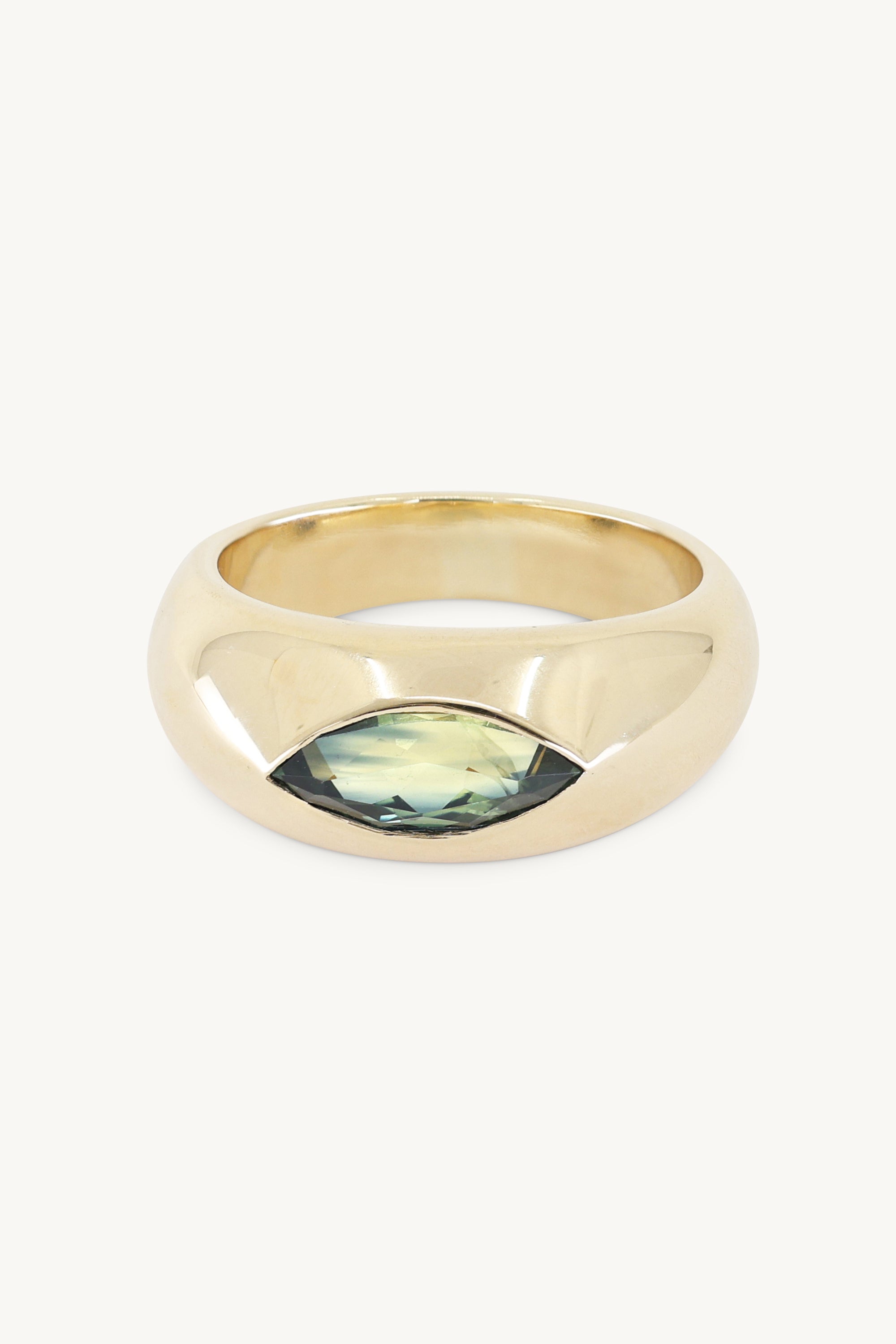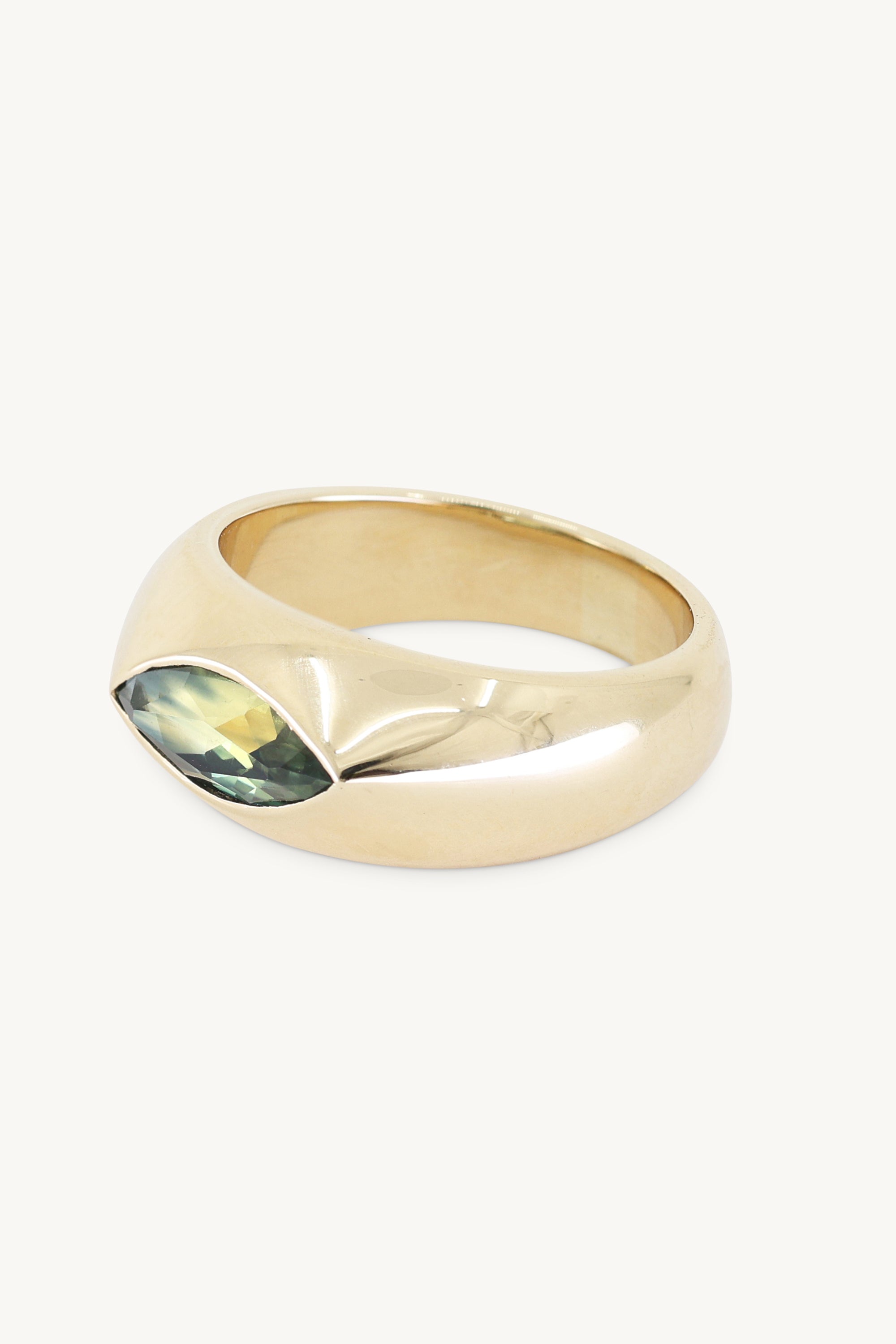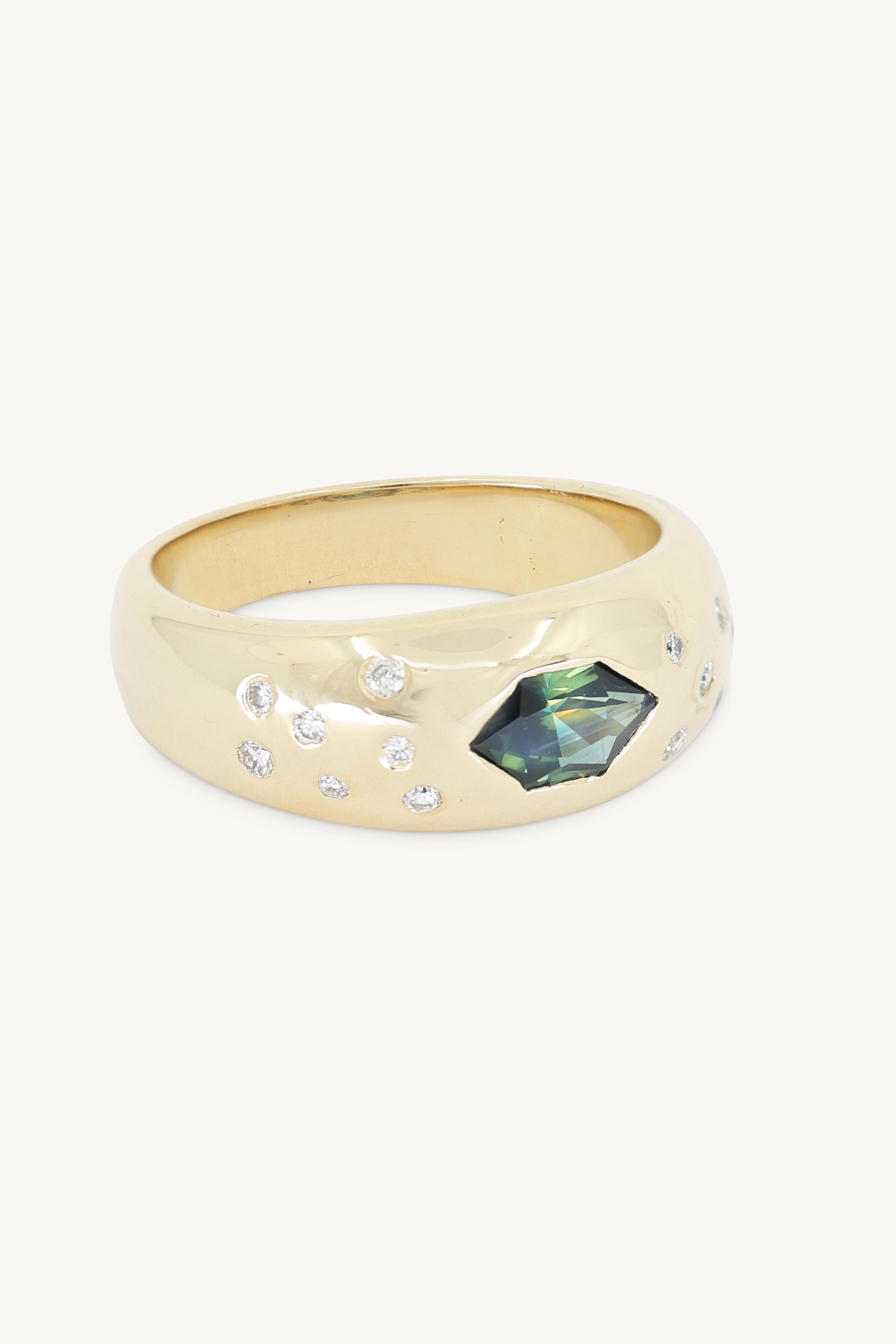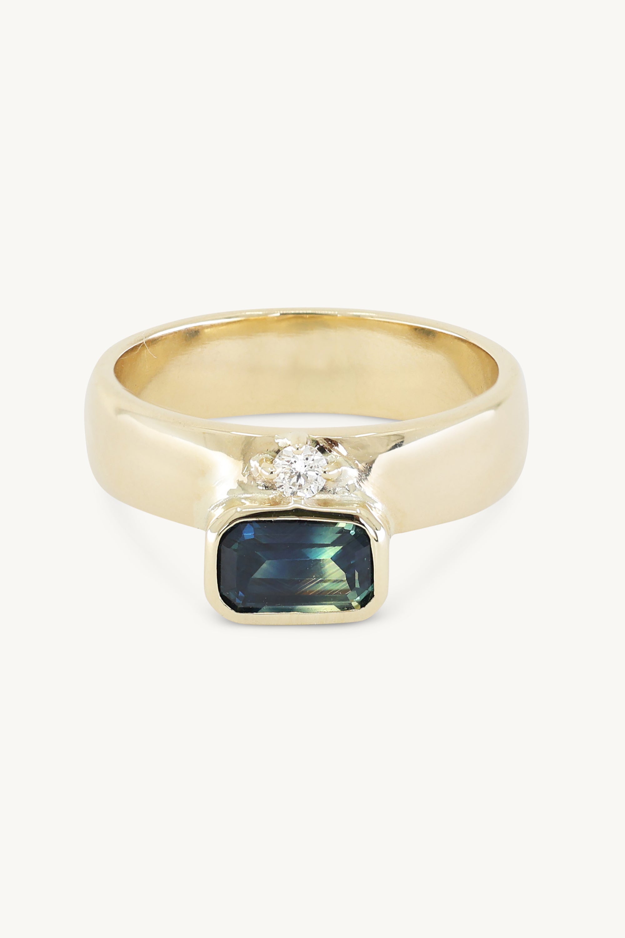 Hand crafted in 14K Yellow Gold, this stunning ring features a unique green fancy cut 3.4ct Australian Parti Sapphire stone. The Sapphire is claw set in 14K Yellow Gold with 6 brilliant white accent diamonds.