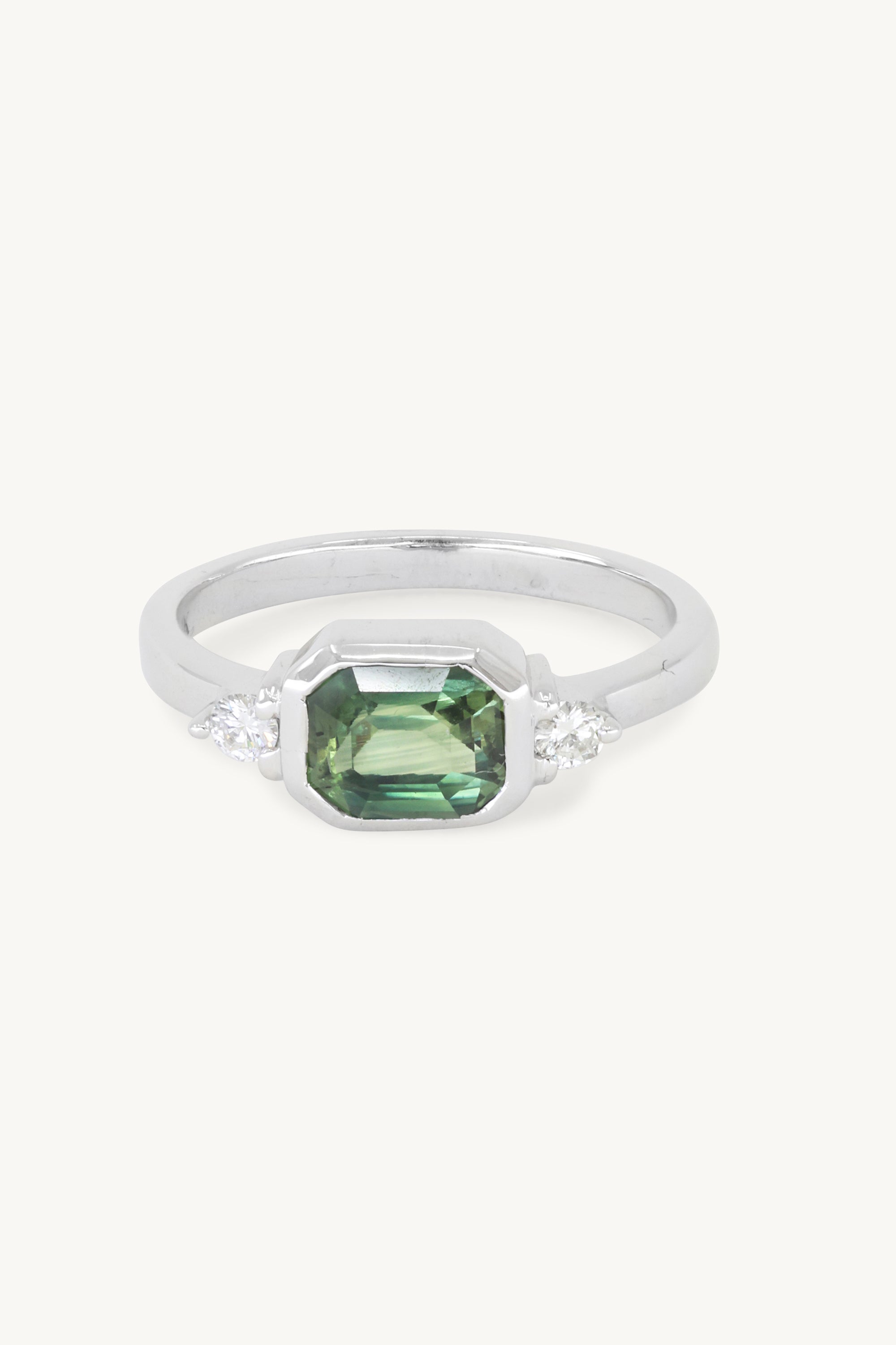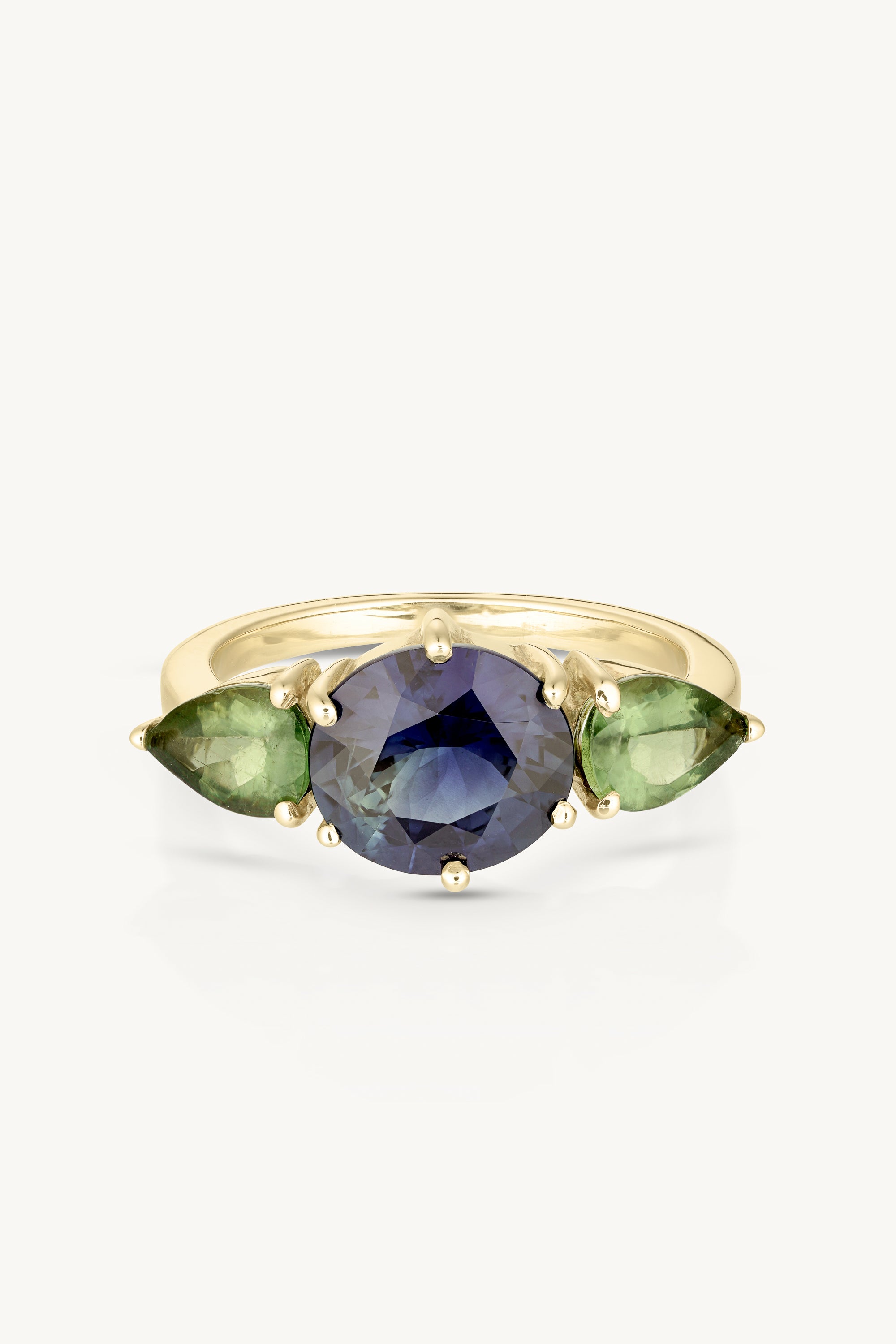 Parti Sapphires are remarkable natural Sapphires often with multiple iridescent peacock tones of green, blue and yellow within each individual stone. This Sapphire in particular has lines of colour and inclusions which run horizontally across the stone.