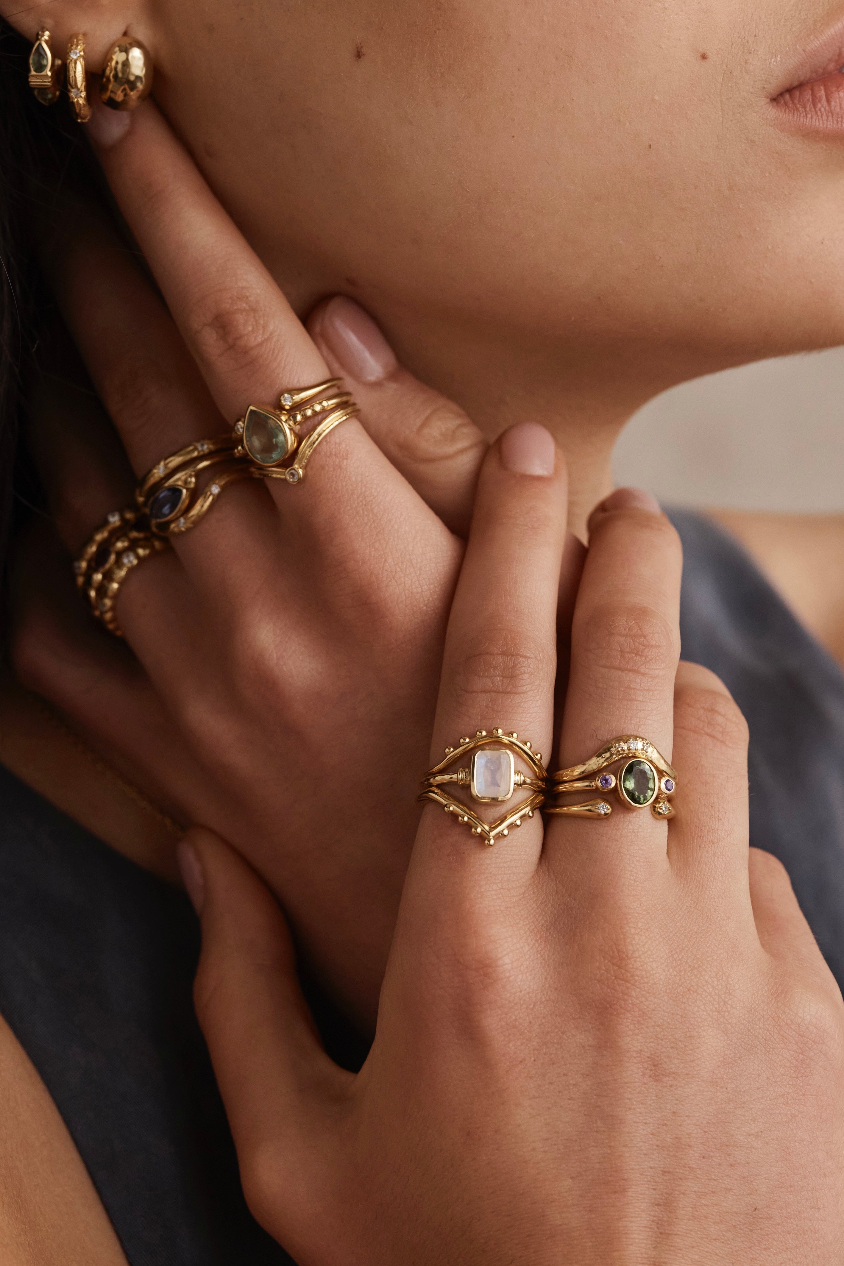 With an oval Apatite taking centre stage and two round Amethysts by its side, it’s a trio that knows how to shine whether solo or stacked.
