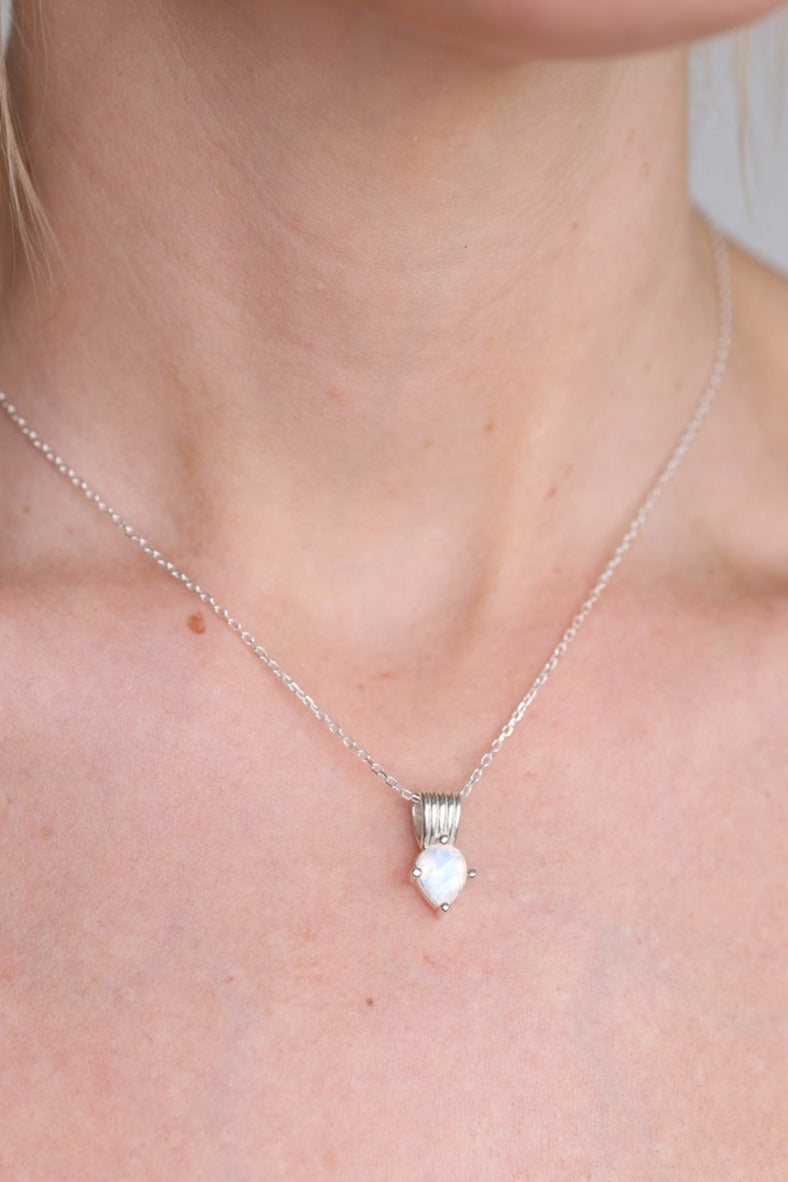 Following the success of our favourite stacking ring the Amie, we are introducing the Amie necklace. This stunning piece features a luminous hand cut pear stone, claw set with a ribbed thick bale.