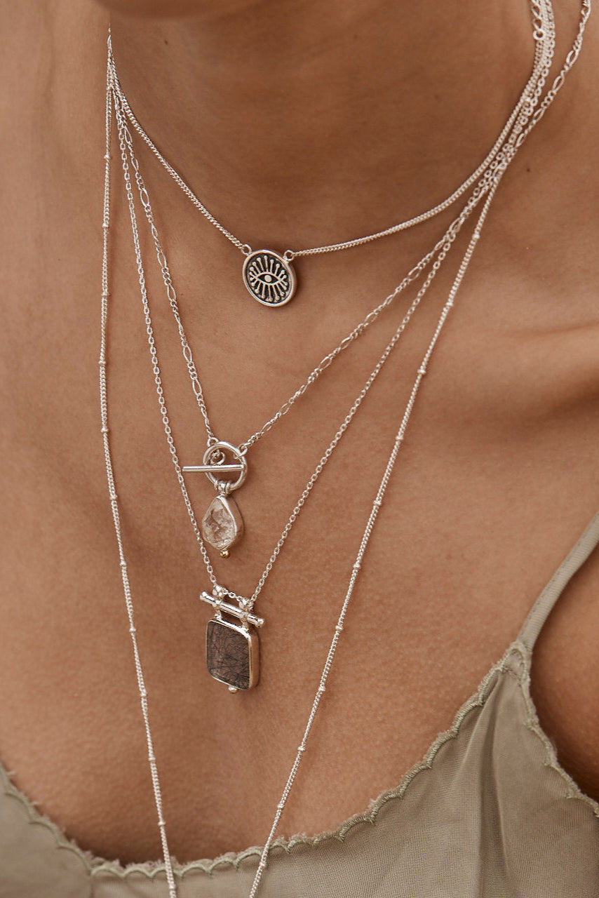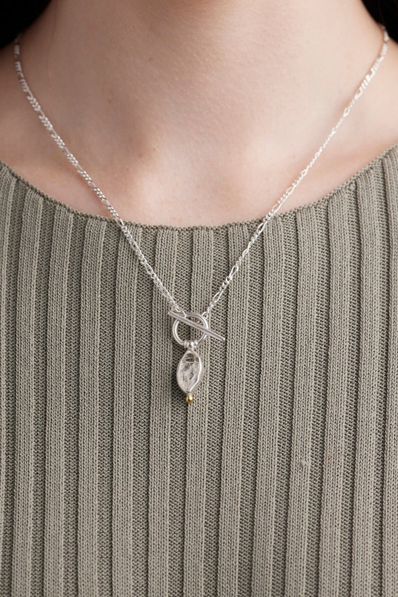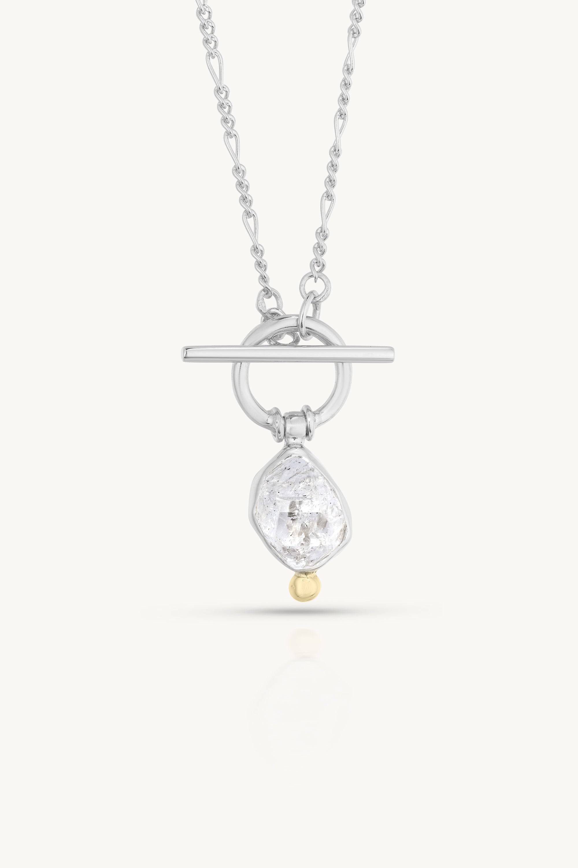 The Herkimer Diamond Silver necklace features a stunning natural herkimer quartz diamond pendant on a delicate figaro style chain. The chain clasps at the front of the necklace with a toggle style clasp that forms part of the pendant.