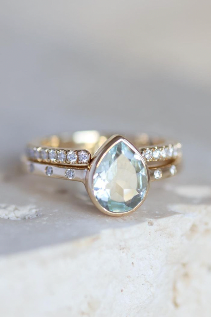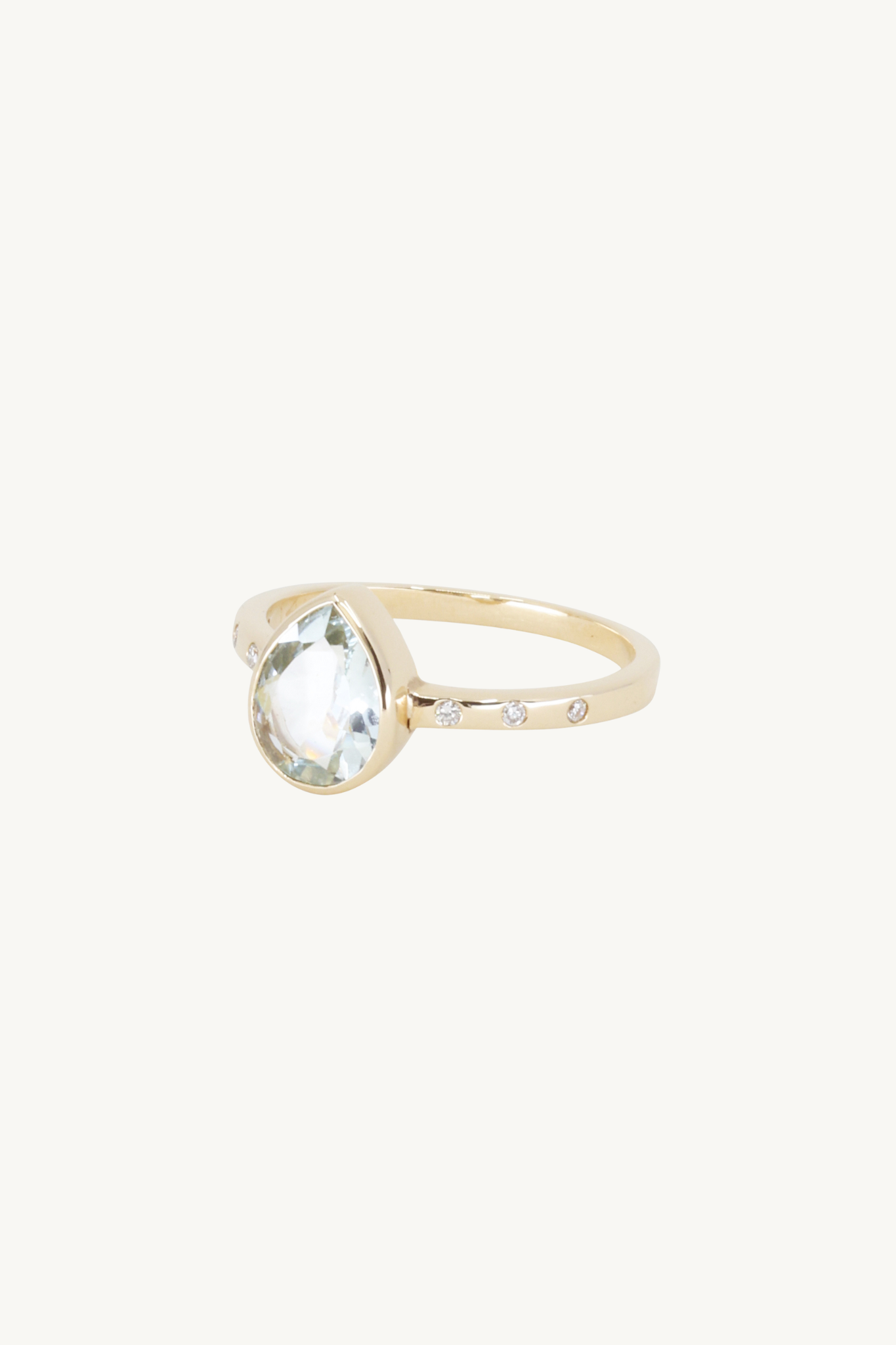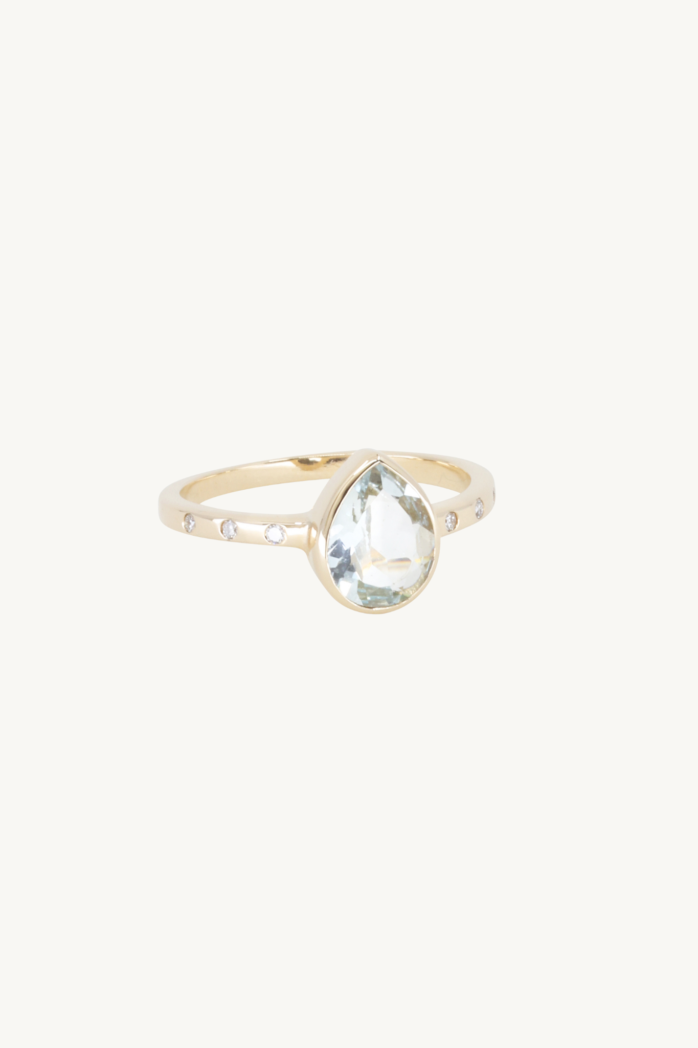 This little beauty is a 9K yellow gold band set with a flawless aquamarine stone. This beautiful stone throws soft blues with a beautiful faceted finish.
