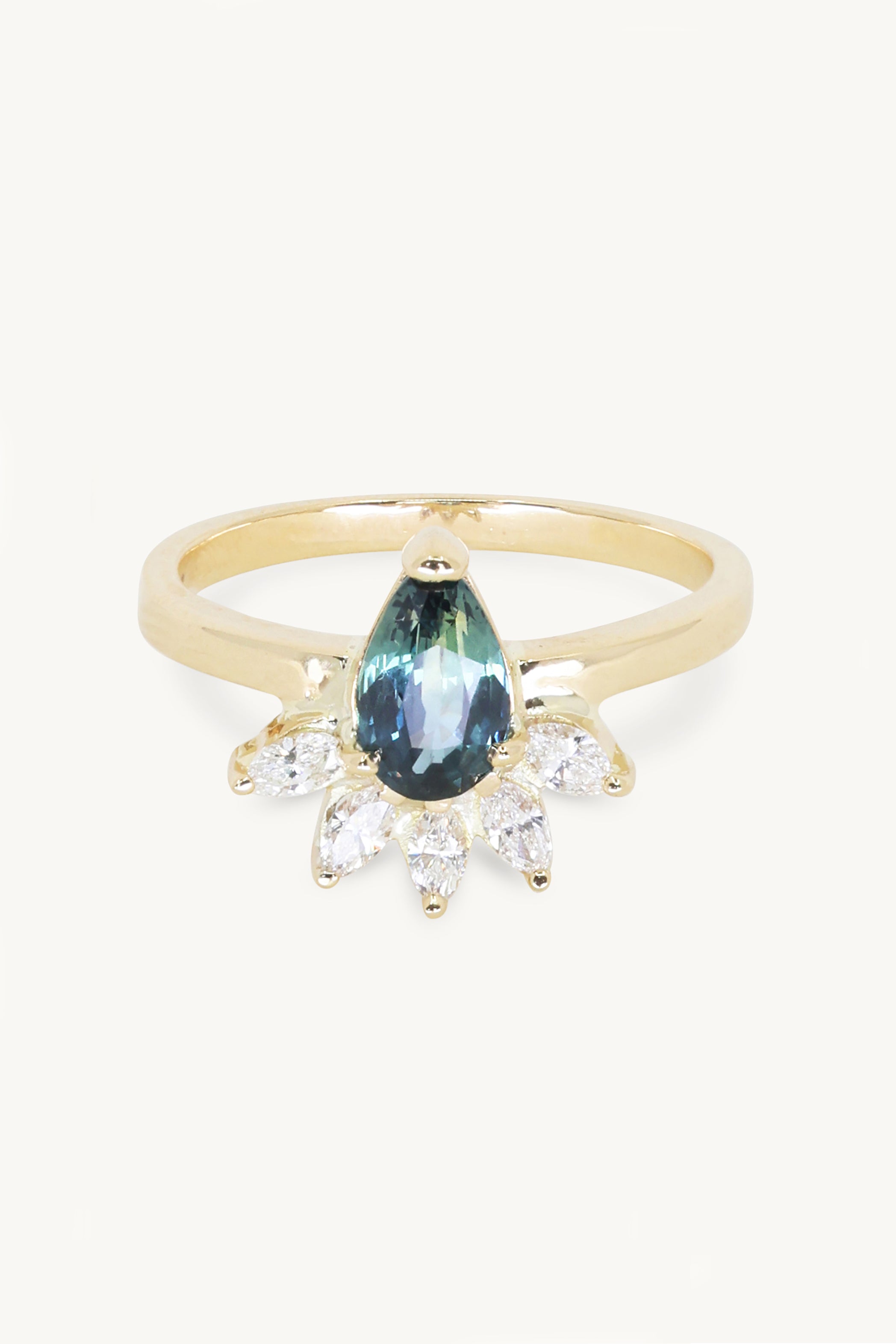 The Etherial Sapphire band features a claw set teal blue Australian Parti Sapphire set with a halo of 5 marquise Diamonds.